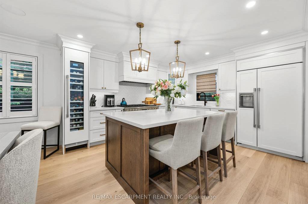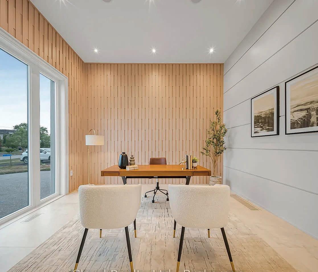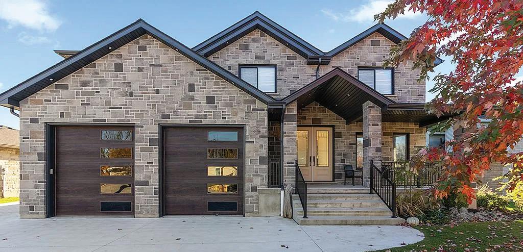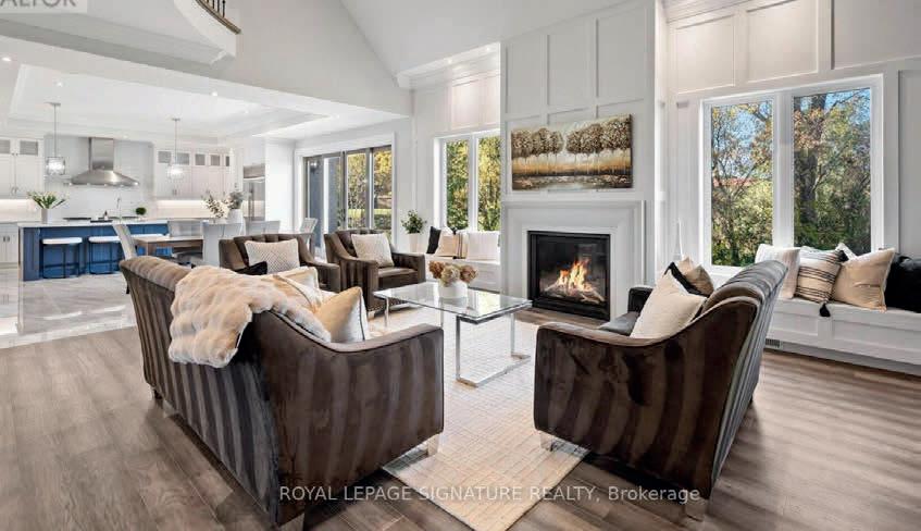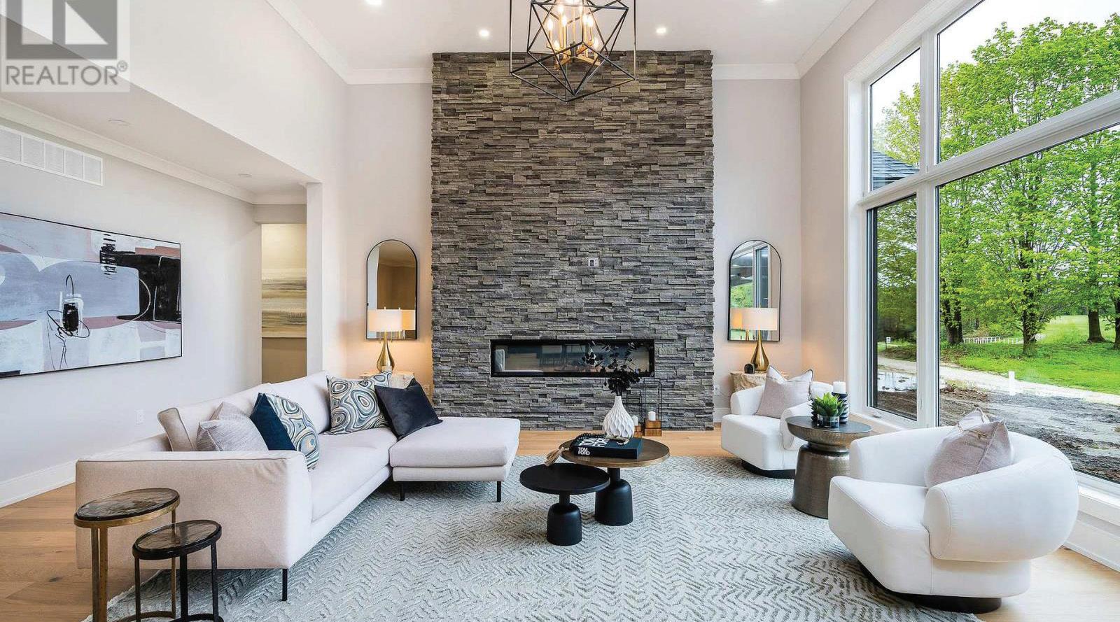 Set on a quiet dead-end street with views of the countryside, this stunning luxury home backs onto protected land while being just steps from the park, rink, courts, and library. The home showcases exceptional craftsmanship with a striking stone and stucco exterior and elegant interior finishes throughout. Inside, a grand entrance welcomes you with heated porcelain tile floors, vaulted ceilings, and a custom wood staircase with glass railing. The main level features engineered white oak flooring and exposed beam accents, creating a warm yet refined atmosphere. The living and family rooms both showcase tiled feature walls with built-in electric fireplaces, while the dining area includes custom cabinetry and a stylish dry bar with quartz counters, ideal for entertaining. The gourmet kitchen is the heart of the home, featuring an oversized island, quartz countertops, high-end stainless steel appliances, a gas range with custom hood, and a walk-in pantry. A private office, plus a mudroom and laundry with heated floors and garage access, add everyday convenience. Upstairs, the luxurious primary suite offers a private balcony, walk-through closet with custom organizers, and a spa-inspired 6-piece ensuite with soaker tub and glass shower. Two additional bedrooms each feature their own private ensuite bathrooms with heated floors. The finished lower level provides excellent flexibility with a second kitchen, two bedrooms, a rec room, and walk-out to the patio, making it ideal for extended family or guests. Outside, enjoy the additional detached heated two-car garage with gas and water lines ready for a future pool, all in a peaceful setting surrounded by nature.