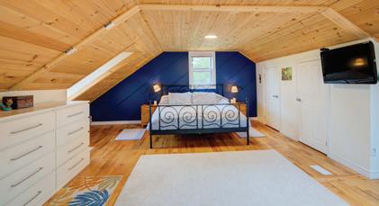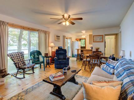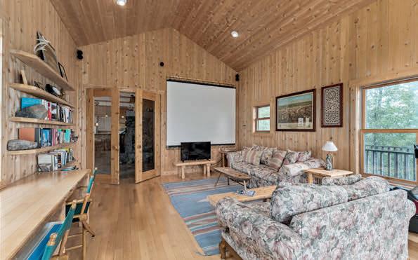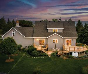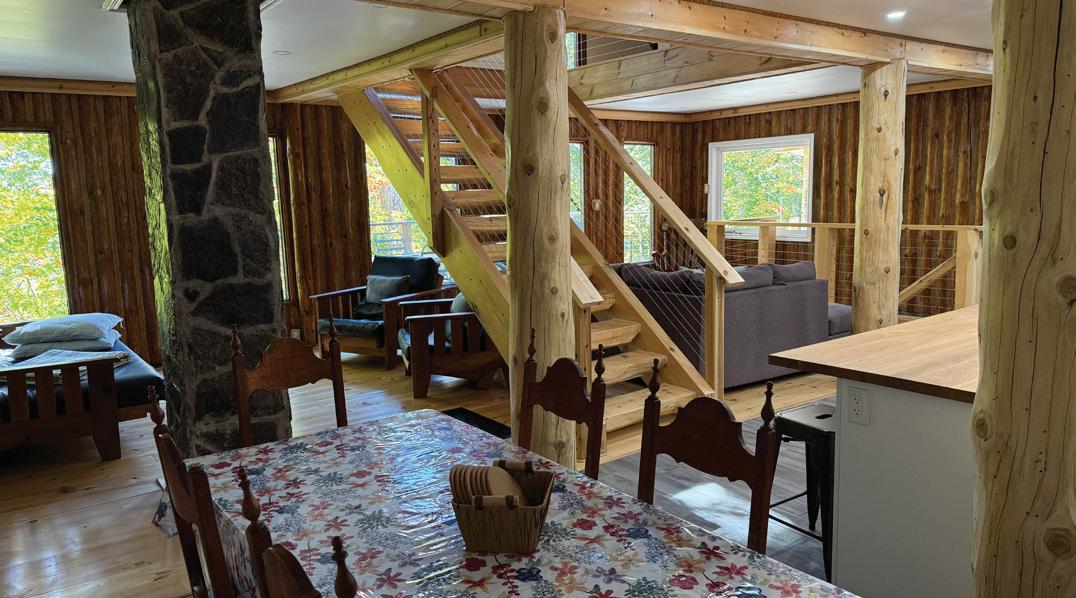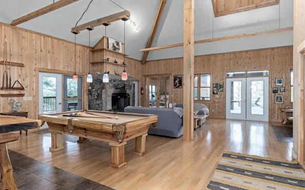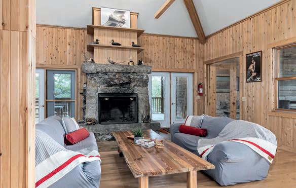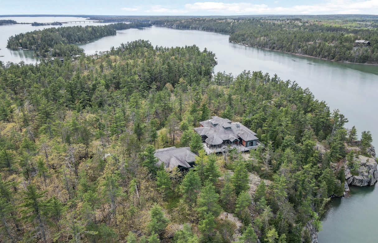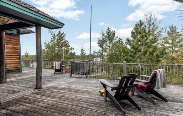 Nestled atop a 100-foot rock cliff sits the majestic cottage and bunk house, designed and built for large family gatherings. The views of the channel below are unparalleled with north-east facing vistas. The main house features 2,613 sq ft of open concept living area with a large kitchen, living room with wood burning fireplace and a dining area large enough for the whole family. The main house also includes two large bathrooms, one bedroom, as well as the library and media room off the living room, and the 676 sq ft screened in porch and outdoor kitchen.