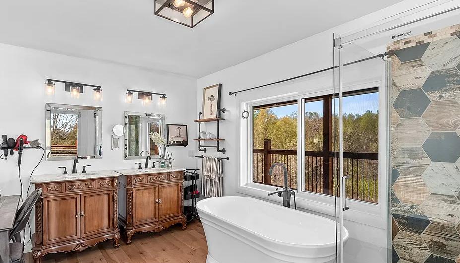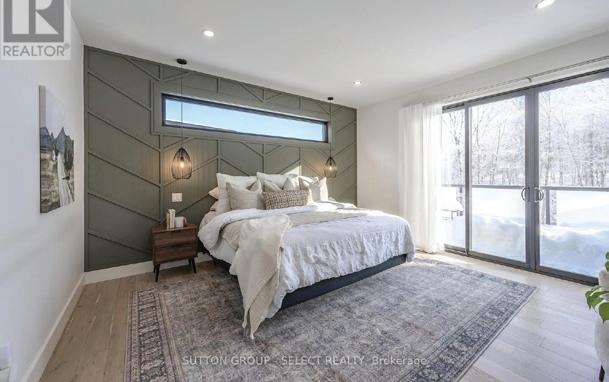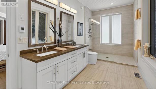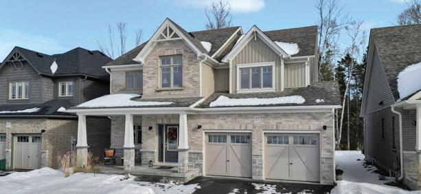 Luxury Custom Home Backing Onto Protected Land. This stunning custombuilt 3-bedroom, 3-bathroom home (2023) perfectly positioned backing onto protected land and directly across from the river in beautiful Wasaga Beach. Designed to blend modern luxury with timeless character, the home features large mouldings, custom doors, exposed wood beams, and a striking stone fireplace. The bright open-concept layout showcases wall-towall windows overlooking the forest, filling the home with natural light. The showpiece kitchen offers a large quartz island, blue and white cabinetry, full quartz backsplash, mini wine fridge, and Wi-Fi enabled appliances. Upstairs, spacious bedrooms include custom walk-in closets, built-ins, and designer touches, while the primary suite features a fireplace and spa-inspired ensuite with a floating tub and double quartz sinks. Luxury upgrades include hydronic in-floor heating, heated driveway and walkways, epoxy garage flooring, smart home system, motorized blinds, security cameras, sprinkler system, and a hard-wired generator. Enjoy outdoor living with a built-in BBQ, patio with hot tub hookup, and a private forest backdrop.