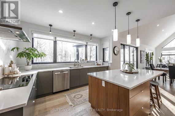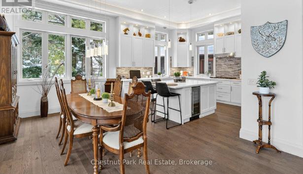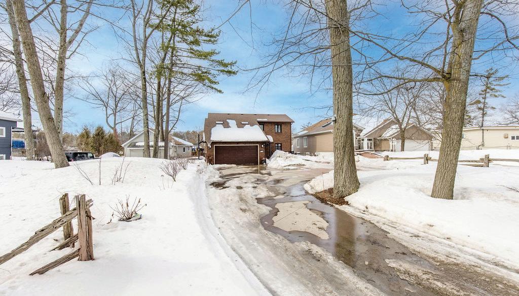 Enjoy riverfront living on the beautiful Nottawasaga River with direct boating access to Georgian Bay. Set on a generous 50 x 200 ft lot, this allbrick home offers approximately 2,500 sq ft above grade plus 1,400 sq ft of finished lower-level space, ideal for large families or multi-generational living. A landscaped walkway leads to the 20-ft dock with boat lift, providing easy access for boating, kayaking, paddleboarding, and fishing. The home features 4+1 bedrooms and 3.5 bathrooms, vaulted ceilings, hardwood floors, pot lights, and two gas fireplaces. The updated kitchen includes stainless steel appliances, an induction cooktop, granite counters, a glass backsplash, and a breakfast bar, opening into bright living spaces designed for everyday comfort and entertaining. A sunroom offers relaxing views of the backyard and river setting. The finished lower level, with a separate entrance, second kitchen, bedroom, wet bar, and laundry creates excellent flexibility for an in-law suite or potential income opportunity. Additional highlights include parking for 6–8 vehicles, a double garage, mature lot depth, and a location just minutes from the open waters of Georgian Bay. Enjoy being within walking distance to the sandy beaches of Wasaga Beach and nearby Nordic trails for year-round recreation.