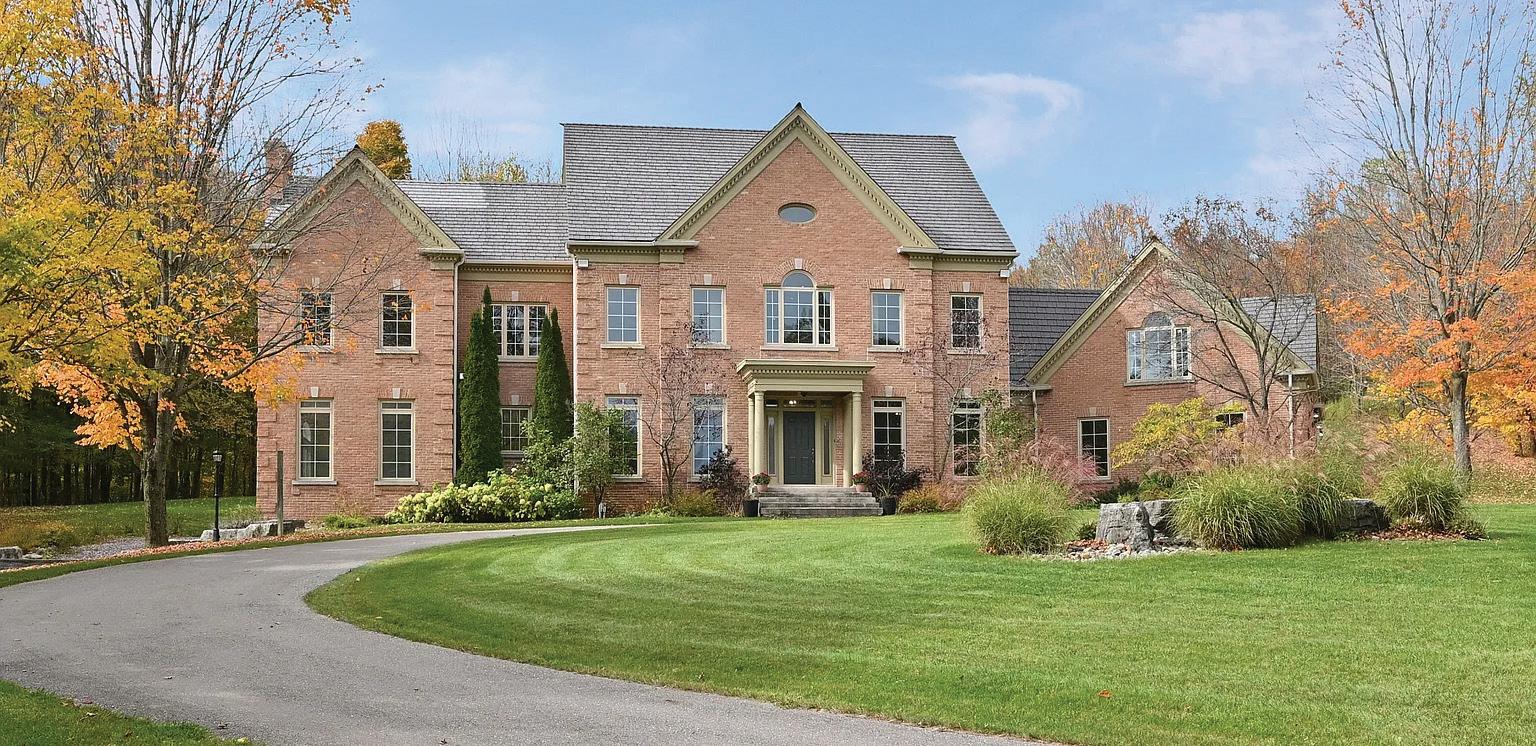 Welcome to this extraordinary private estate nestled on 92.15 acres of pristine forest, complete with a pond, stream, meadows and kilometers of private nature trails. A gated entrance framed by handcrafted Owen Sound stone pillars and wrought-iron gates leads to a winding drive and a secluded hilltop estate. Designed by an architect and built by Bristol Homes, this residence showcases impeccable craftsmanship with Owen Sound stone, copper accents, Indiana limestone window sills, and a 50-year Enviroshake roof ($275K). Inside, the grand foyer features heated slate floors and custom lighting. The formal living room boasts a stunning stone fireplace and arched windows, while the elegant library offers custom bookcases and solid wood finishes. The chef’s kitchen is both functional and beautiful, with granite counters, heated floors, a large breakfast bar, and camera monitors offering views of the gated entrance. The principal suite is a serene retreat with Brazilian mahogany floors, walk-out to the pool, and a luxurious ensuite. Two additional bedrooms share a well-appointed 5 pc.ensuite. The lower level is ideal for entertaining, featuring a theatre zone, games room, gym, sauna, and a state-of-the-art mechanical room. Outdoors, enjoy a heated saltwater pool, stone patio, and matching cabana with sauna and 100-amp service. The beautifully renovated separate 800 sq ft guest house includes two bedrooms and Loewen windows. A 1,500 sq ft four-bay garage offers 11-ft ceilings, radiant heating, and built-in sound. This rare offering combines total privacy with convenient access to Markham, Aurora, GO Transit, Hwy 407/404, and is just 50 minutes to Pearson Airport. This property is not just a home-it’s a Timeless Estate where Luxury and Nature Live in Harmony.