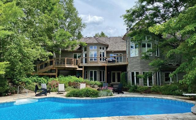 Welcome to this stunning luxury waterfront estate, a blend of elegant design, modern amenities, and breathtaking natural beauty. The exterior showcases a refined mix of stone, stucco, and wood beam accents, setting the stage for the architectural charm that awaits inside. Step into a spacious interior featuring rich hardwood floors throughout the main level. A great room with soaring two-story ceilings is adorned with wood beam details and a wall of windows offering captivating views of the expansive rear yard and waterfront. The main floor also boasts a formal dining room and an office with French doors and vaulted ceilings. The gourmet kitchen is a chef's dream, equipped with granite countertops, a large island with breakfast bar seating, a Subzero fridge, Viking gas range, and walk-in pantry. Adjacent is a cozy Muskoka room with built-in speakers and a gas line for your BBQ, perfect for year-round entertaining. The main floor primary suite is a private retreat, featuring a walkout to the deck with tranquil views of the yard, a luxurious 6-piece ensuite, and a spacious walk-in closet. The upper level includes three more bedrooms, a 5-piece bath, and a spacious great room over the garage with in-floor heating. The fully finished walkout basement offers a theatre and games room with surround sound, two additional bedrooms, a 4-piece bathroom, and radiant in-floor heating. The backyard is an entertainer's paradise, boasting an in-ground heated saltwater pool with waterfall features, lighting, and a tanning ledge, surrounded by multiple seating areas.