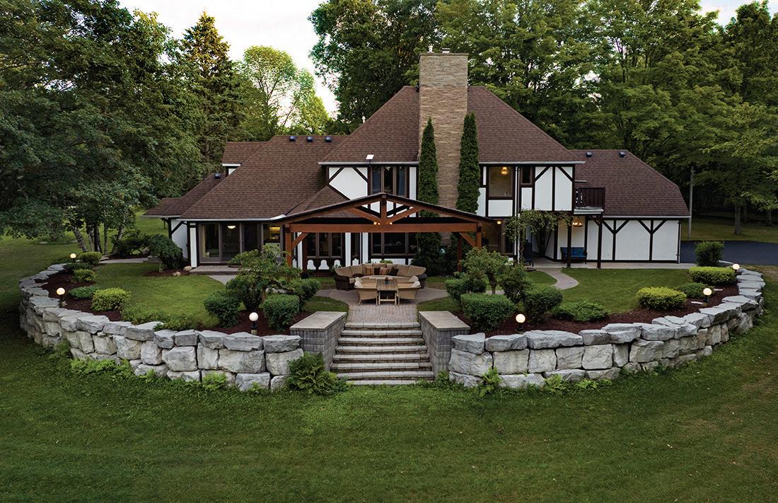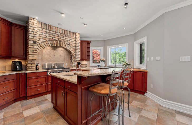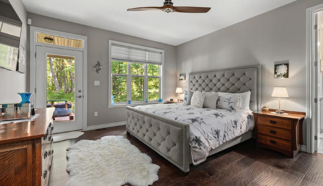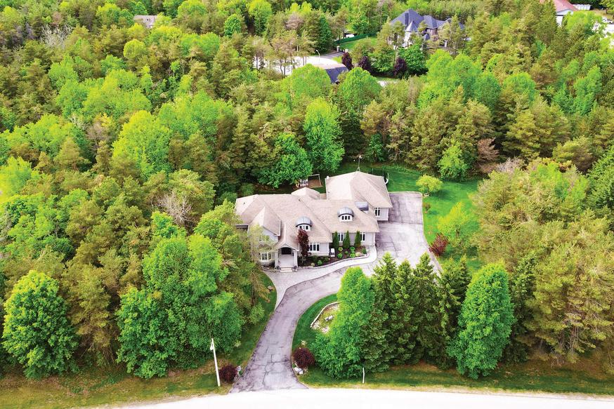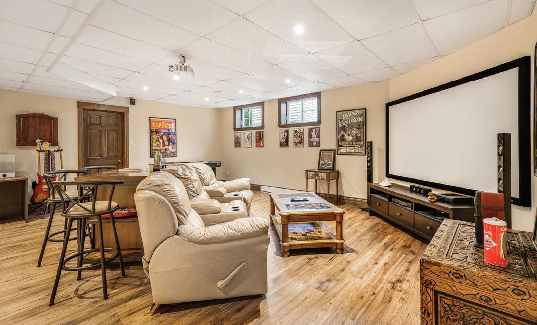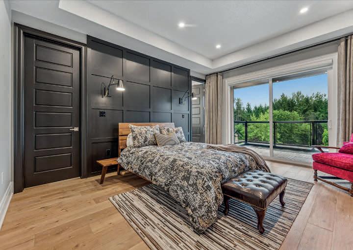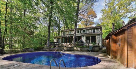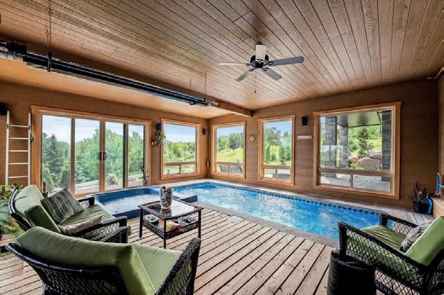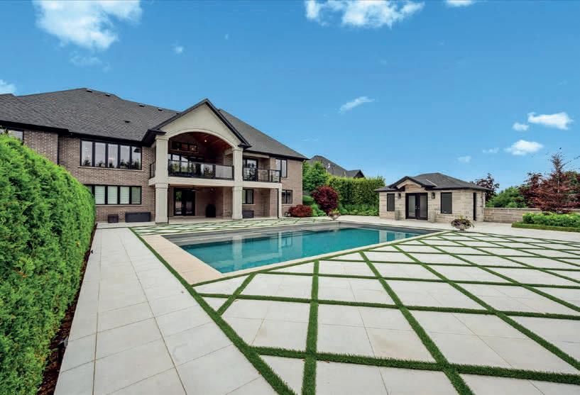 The lower level includes a wine cellar with tasting room, custom wet bar, media lounge, gym, and a separate entrance, while the garage boasts a stateof-the-art golf simulator. Outdoors, it’s Muskoka in the region, with $2 million in landscaping, a saltwater pool with waterfall, hot tub, heated pool house, outdoor bar and kitchen, and a heated patio.