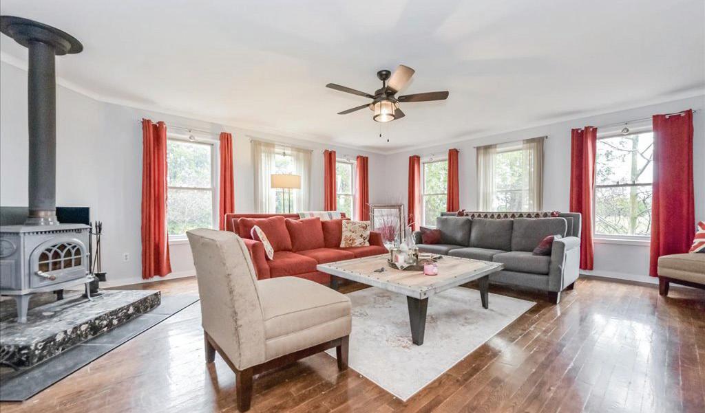 potential rental income & a Large Barn & Drive Shed that provides plenty of room for storage, equipment or hobbies. Inside, the open concept design includes expansive living areas, 11’ large bright windows that overlook the surrounding country side & a mix of 2 x 4 ceramic tiles & hardwood floors throughout. See our Virtual Tour at https://youtu.be/yrsmiYX_lqE.