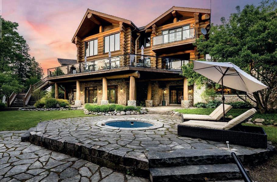 in-ground hot tub. A true legacy property, offering a level of privacy, scale + beauty that simply can’t be replicated. Massive log doors feature hand-carved artwork & open to 20-ft high grand foyer a Shooting-theRapids carving. Main floor-dining room, living room with wet bar, sitting room with beautiful lake views+office. Custom Kitchen offers a Dacor + Thermador stoves, oven, Sub-Zero fridge/wine cooler, butlers pantry, 2 dishwashers+fireplace. The spectacular main floor primary suite has vaulted ceilings, stone f/p +spa-like ensuite with private deck.Upstairs: 3 beds, +3 baths + family room. The without lower level includes a new accessible bedroom with ensuite, laundry, games room, gym+Sonosequipped home theatre. 20-seat English pub offers-draft taps/SubZero cooler/keg fridge, ice maker+custom stone fireplace. In-flr heat throughout main home/garage/guesthouse. 4-car heated garage. New boiler, cedar shingled roof, irrigation, Starlink internet/cell tower, cobblestone driveway, 90-ft stone pier.