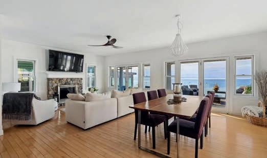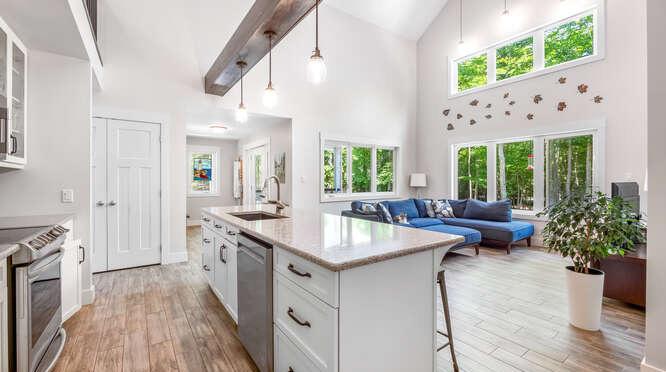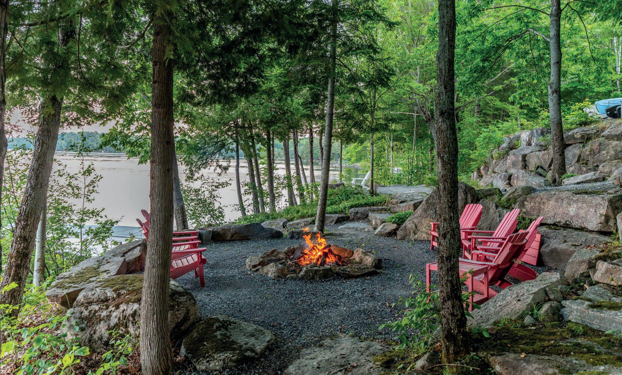 Nestled atop a 100-foot rock cliff sits the majestic cottage and bunk house, designed and built for large family gatherings. The views of the channel below are unparalleled with north-east facing vistas. The main house features 2613 sq ft of open concept living area with a large kitchen, living room with wood burning fireplace and a dining area large enough for the whole family. The main house also includes two large bathrooms, one bedroom, as well as the library and media room off the living room, and the 676 sq ft screened in porch and outdoor kitchen.