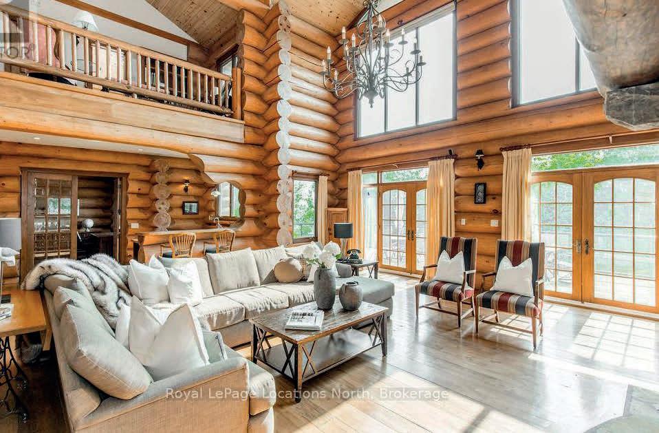 Welcome to one of Canada’s largest log mansions, a Yellowstone of the North that rivals the magnificent log building in the Yellowstone TV series. This breathtaking, one-of-a-kind waterfront estate at the very point of Georgian Bay’s Cedar Point redefines luxury living. Built in 2002 as a private resort, set on 4.37 acres of landscaped grounds with 2 beaches over 412 ft of pristine shoreline.With close to 14,000 sq ft, every detail of this custom-designed home was lavished with uncompromising quality. The main residence features 8 beds, +8 baths, +2nd living quarters with 2 beds, +2 baths. Every room is a statement with soaring ceilings, rich finishes + breathtaking views. Outdoors, this waterfront sanctuary captivates with private sandy beach, cabana, gentle streams + 90-ft stone pier offering panoramic views. Boaters will value an 80-ft seasonal dock at the 2nd, pebble beach. Birders will be impressed to learn that Cornell Lab identified 100+species. At night, gather at the pier under a canopy of stars/luxuriate in the 8-person