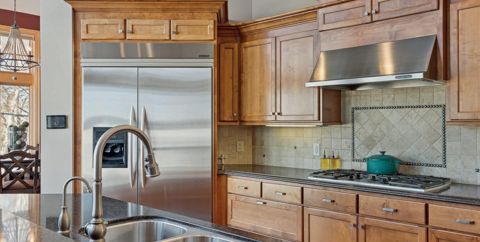 The kitchen is a standout, featuring stainless steel appliances, a tile backsplash, walk-in pantry, and a large center island with breakfast bar seating, along with premium upgrades like a gas cooktop, pot filler, and wall oven.