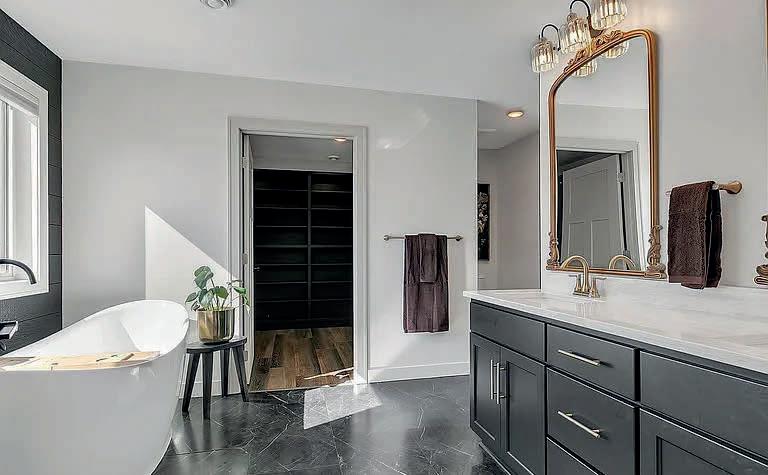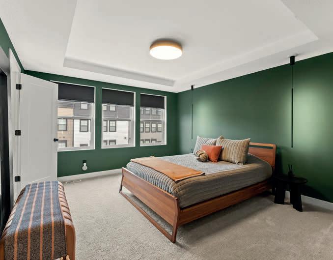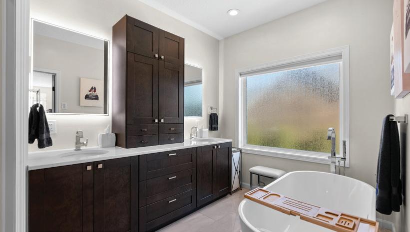The split-bedroom layout offers privacy, with the primary suite as a relaxing retreat. It features statement lighting, walk-in closet, and ensuite with heated floors, walk-in tiled shower, and double vanity.