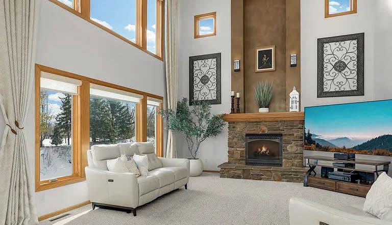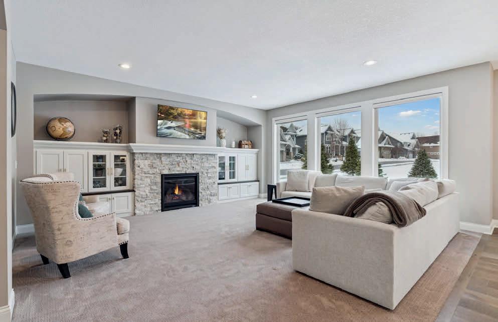 The living room offers warmth and style with a stone-surround gas fireplace and tray ceiling, nearby a designated dining space and bright sunroom with multiple large windows. Walkout access to a maintenance-free deck, perfect for indoor-outdoor living.