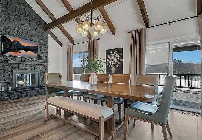 Nestled on a breathtaking 5-acre peninsula with over 1,000 feet of level shoreline along both Park and Krays Lake, this rare property offers exceptional space, privacy, and natural beauty, surrounded by mature trees and panoramic water views that create a peaceful retreat. The thoughtfully updated and expanded 7-bedroom, 4-bathroom home blends refined finishes with comfortable living, featuring generous gathering spaces, a spacious primary suite with a spa-inspired bath and private lakeview deck, and an oversized heated garage with a second kitchen ideal for entertaining. With expansive indoor and outdoor living areas designed for both connection and privacy, the property is perfectly suited for multigenerational living or shared ownership, offering a one-of-akind waterfront retreat where lasting memories and traditions are made.