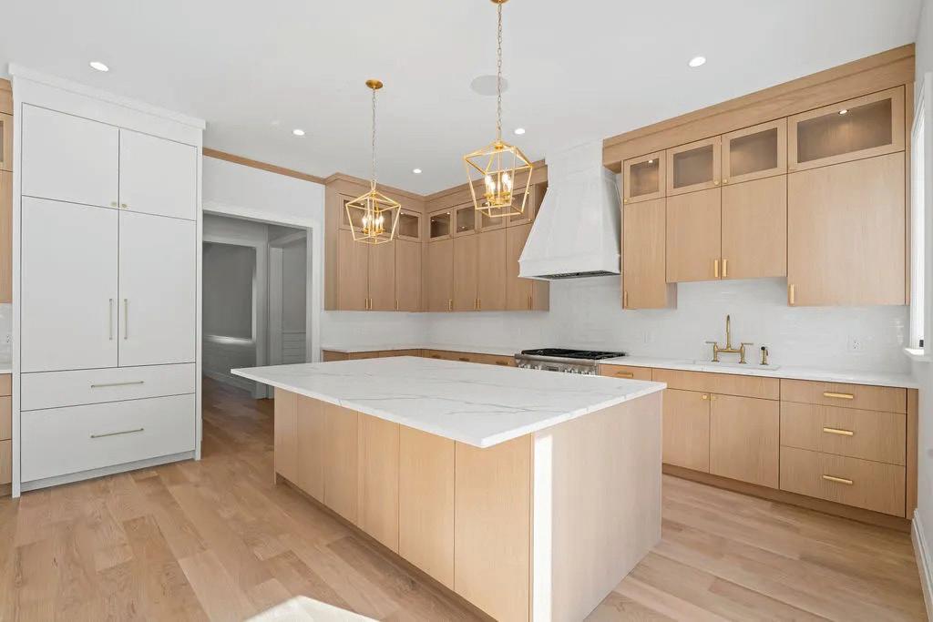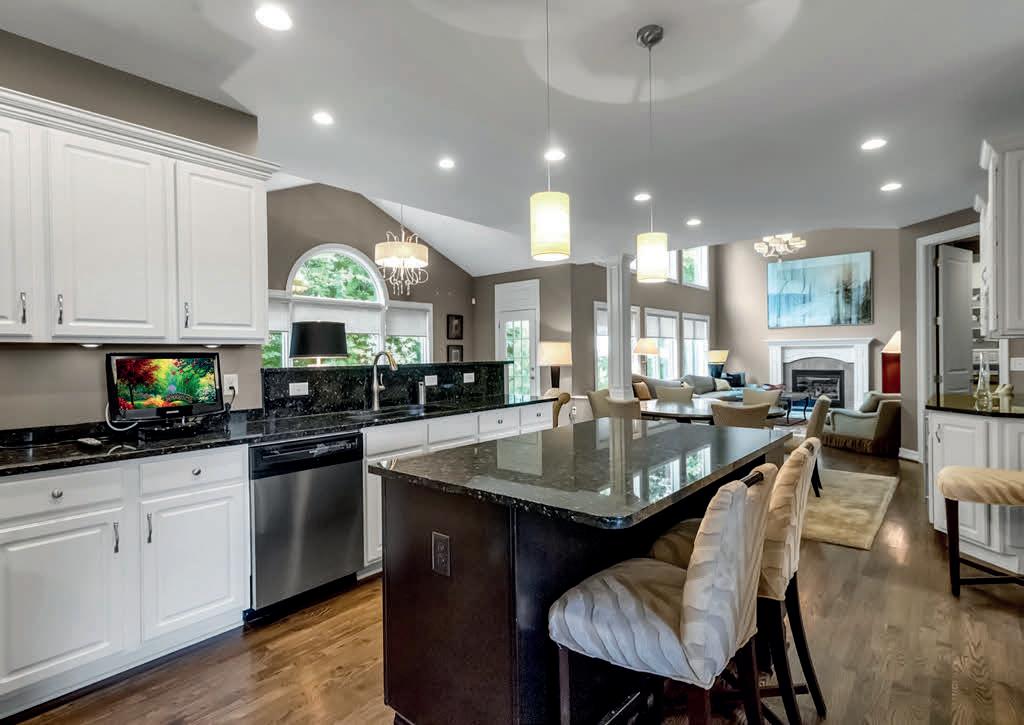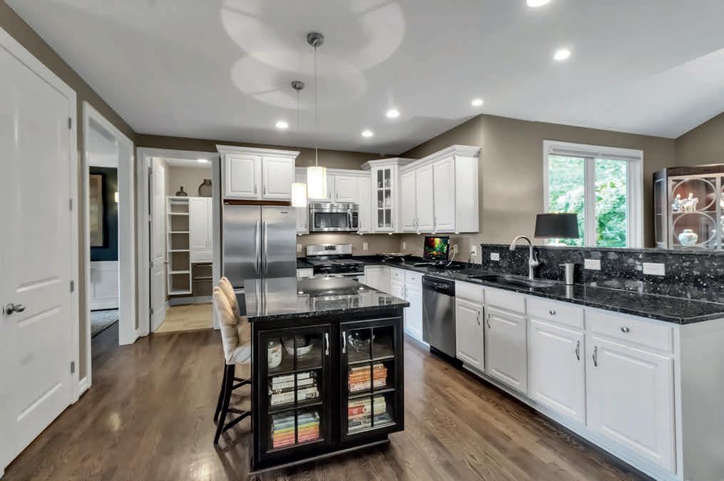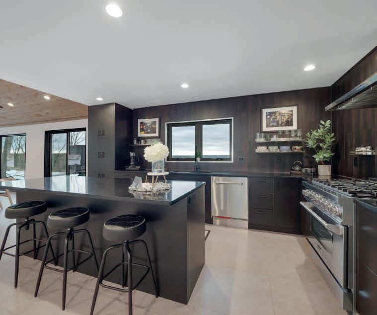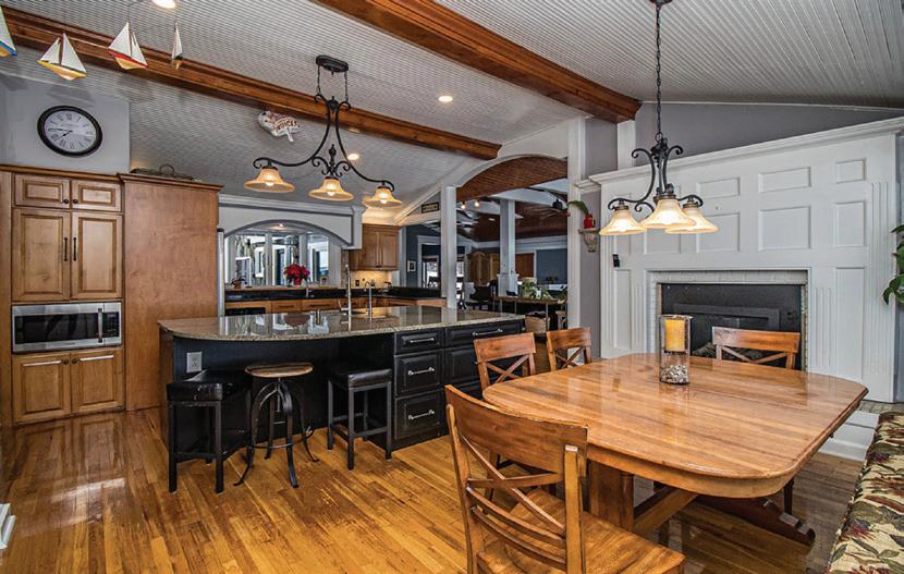 outdoor entertaining patio and grounds — the perfect spot for outdoor entertaining after a day on the lake. A double sided fireplace adds separation and drama to the living spaces. The luxe kitchen features a large eat-at island and a second scullery kitchen for additional prep & storage. An attached two car garage connects to the family entrance with mud room and laundry.