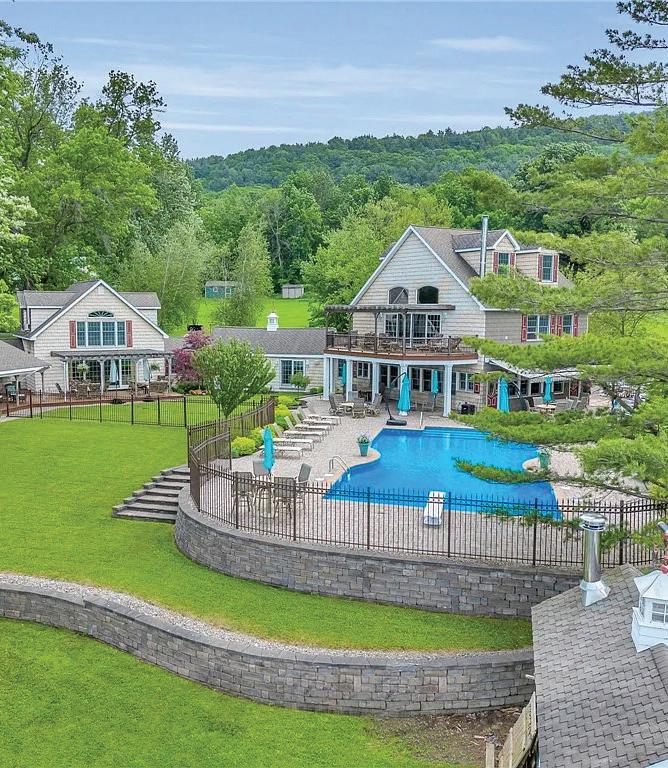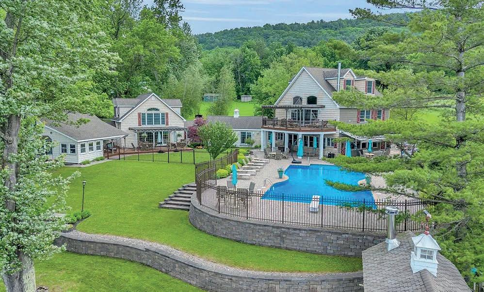 A Private French Country Château Overlooking Saratoga Lake Commanding 9.15 acres of pristine, private grounds, this 7,237± square-foot custom French Country château represents a rare opportunity to acquire a legacy estate in one of Saratoga’s most coveted settings. Designed to international luxury standards, the residence blends classical European influence with modern, uncompromising craftsmanship—offering an elevated lifestyle defined by privacy, elegance, and enduring value. The home features five expansive bedroom suites and 7.5 beautifully curated baths, each designed as a private retreat. At the heart of the residence, the chef’s kitchen showcases Miele appliances, an imported Italian backsplash, a dramatic marble island, and an oversized walk-in pantry, catering seamlessly to both refined daily living and largescale entertaining. Grand yet inviting, the Great Room is ideal for hosting distinguished gatherings, while the sophisticated Club Room with full bar offers a refined setting for private evenings and social occasions. A private elevator and grand staircase lead to the Primary Suite, a sanctuary of understated opulence featuring a spa-level white marble bath, freestanding soaking tub, steam shower, and private sauna—a retreat rivaling the world’s finest hotels. Arrival is marked by an elegant porte-cochère, leading to a heated four car garage, thoughtfully designed for discerning collectors. Outdoors, the estate unfolds into a resort-style sanctuary, where a beautifully positioned pool, hot tub, built-in barbecue, and serene natural surroundings frame sweeping views of Saratoga Lake. A separate pool house, complete with kitchenette, bath, and fireplace, provides exceptional accommodations for guests and year-round entertaining. Offered to a global audience seeking privacy, prestige, and architectural distinction, this extraordinary property stands apart as a timeless Saratoga Lake estate— IMPOSSIBLE TO REPLACE!