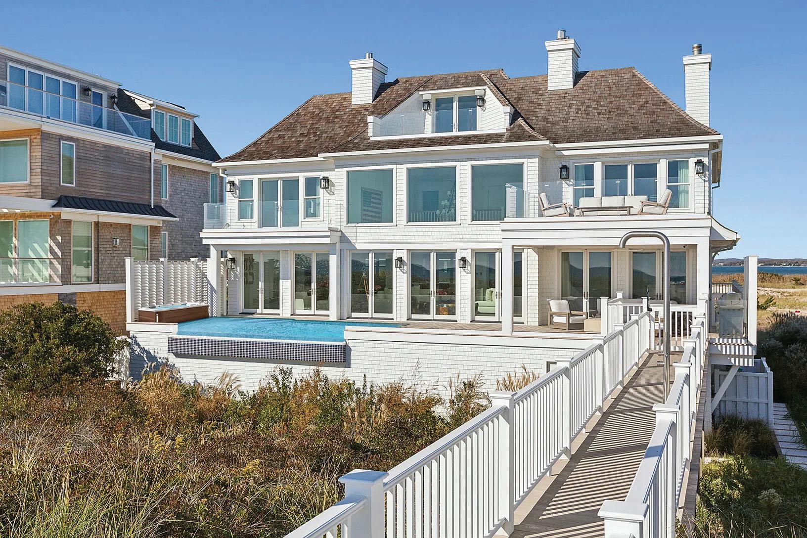 5 BEDS | 5 BATHS | 0.35 ACRES | 4,610 SF | OCEANFRONT | $12,999,000 This south-facing, custom-built Post Modern offers 80 feet of direct ocean frontage with sweeping views of the Atlantic Ocean and bay. Newly renovated from the dunes up, the 4,610± square foot home features five bedrooms and five full bathrooms on the coveted south side of Dune Road. An open-concept great room with 18-foot ceilings and floor-to-ceiling windows creates a bright, seamless flow to outdoor living. The chef’s kitchen is outfitted with top-tier appliances and a center island, complemented by a wet bar and lounge area for effortless entertaining. Outside, a spacious oceanfront deck surrounds a heated infinity-edge gunite pool with waterfall, while a private boardwalk leads directly to the sandy beach. Dual primary suites offer fireplaces, private decks, walk-in closets, and spa-like baths, alongside three en-suite guest rooms. Just 4.7 miles from Westhampton Beach Village, this turnkey oceanfront retreat is ready for immediate enjoyment.