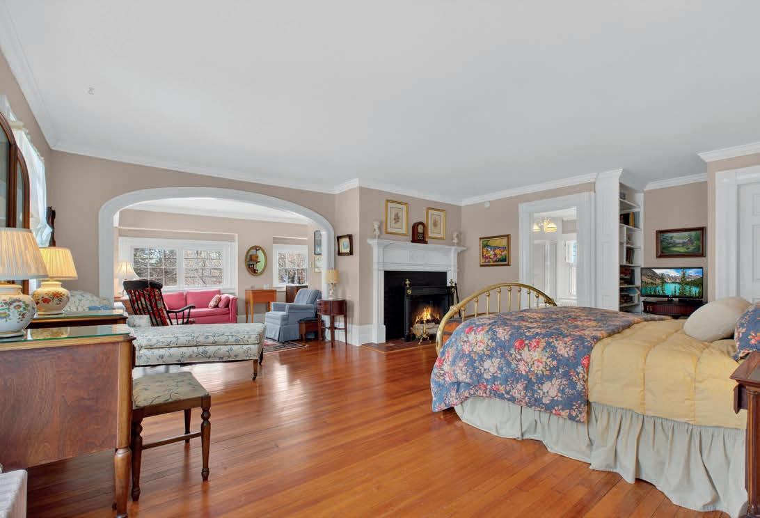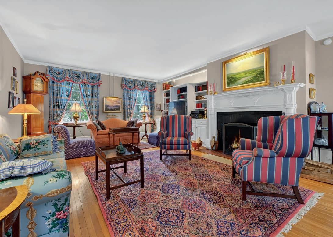 Ten-foot ceilings, oak hardwood flooring, leaded glass entryways, and detailed millwork define the interiors. Six working fireplaces anchor gracious formal rooms designed for gathering and entertaining, including a sunlit study and elegant dining room. The eat-in kitchen with gas fireplace connects to a butler’s pantry and mudroom. A private section of the second level offers two additional bedrooms and bath for guests.