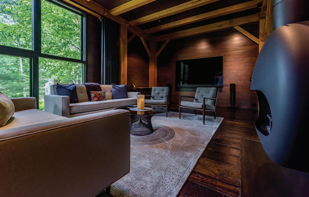 Privately located, the spacious primary bedroom suite includes glazed sleeping room, freestanding bathtub, shower, double vanity, radiant floor heat, WC and stunning views to the natural setting. An office/ gym completes the owners’ domain. Secondary guest bedrooms and a covered porch complete the residence.