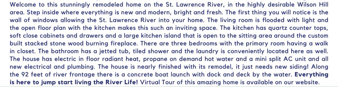 4 Beds | 2 Baths | 1,318 Sq Ft | $699,000 Come check out this one-of-a-kind Clayton Riverfront Cabin located on the protected French Creek with Public water and sewer and amazing views! Enjoy all that this Cabin living has to offer with stunning views of wildlife, protected boating and fishing and views of the main Channel River out your back door! This charming 4 season gem boasts 4 bedrooms and 2 full baths with 2 bedrooms and Bath on each level! Spacious open floor plan with large kitchen with island, dining and living room area with pellet stove, large mudroom and entry way all with amazing views! Large front deck and huge yard leading down to the water with plenty of room for your firepit and relaxing in your ADK chairs after a long day! This property also features a seasonal bunkhouse with game area/sleeping cabin with bathroom! Plus, plenty of storage in the back on the bunkhouse and also a separate shed! This cabin has also been used as an AirBnB and done very well! Winter brings snowmobiling right out front and of course Ice fishing! Walking distance everywhere but you feel tucked away off the beaten path with this very ideal location! Home is turnkey and ready for new owners after a tasteful total remodel the last few years! Call today before it’s too late!!