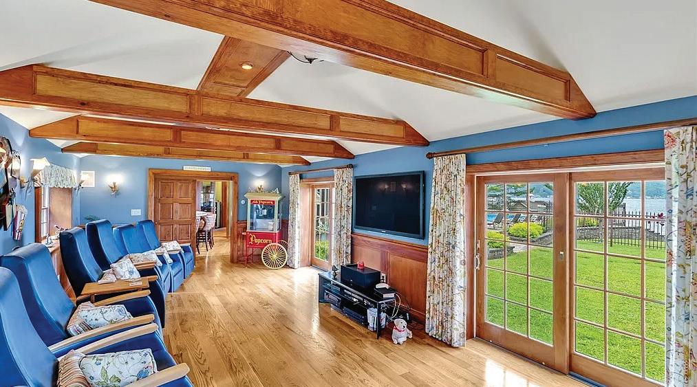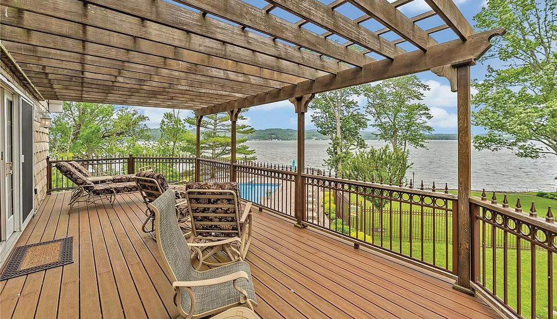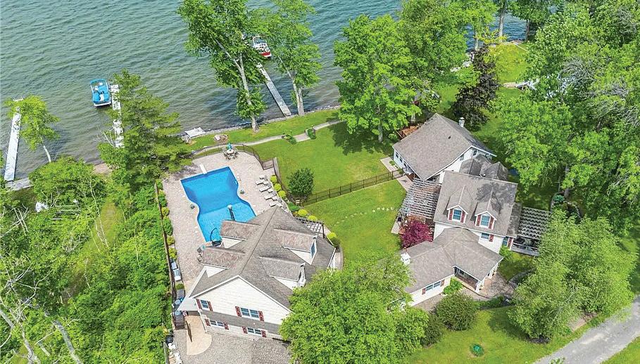 Spectacular year-round lakefront retreat with 150+/- feet of private shoreline and nearly 6,000 sq ft of luxurious living space. Perfectly positioned with an oversized inground heated pool between the home and the lakefront, this masterpiece is designed to impress at every turn. Eloquently styled and masterfully crafted, this extraordinary home features two complete living quarters— ideal for extended family, entertaining guests, or potential B&B use. The interiors boast impeccable oak and maple woodwork, Wood-Mode and Brookhaven built-ins and cabinetry, solid quartz and marble countertops, copper sinks, designer bath and light fixtures, custom drapery and blinds, marble-accented gas fireplaces, a bluestone wood-burning fireplace, and a stunning glassenclosed wine room.