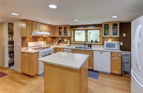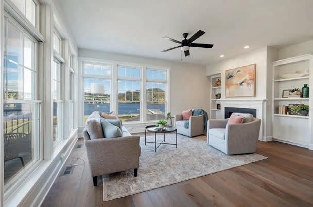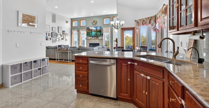 owners’ suite. Living spaces on this single level home share views to the outdoor entertaining patio and grounds — the perfect spot for outdoor entertaining after a day on the lake. A double sided fireplace adds separation and drama to the living spaces. The luxe kitchen features a large eat-at island and a second scullery kitchen for additional prep & storage. An attached two car garage connects to the family entrance with mud room and laundry.