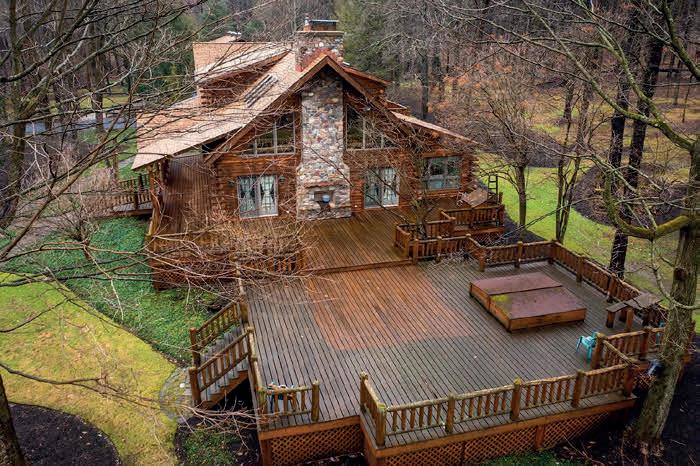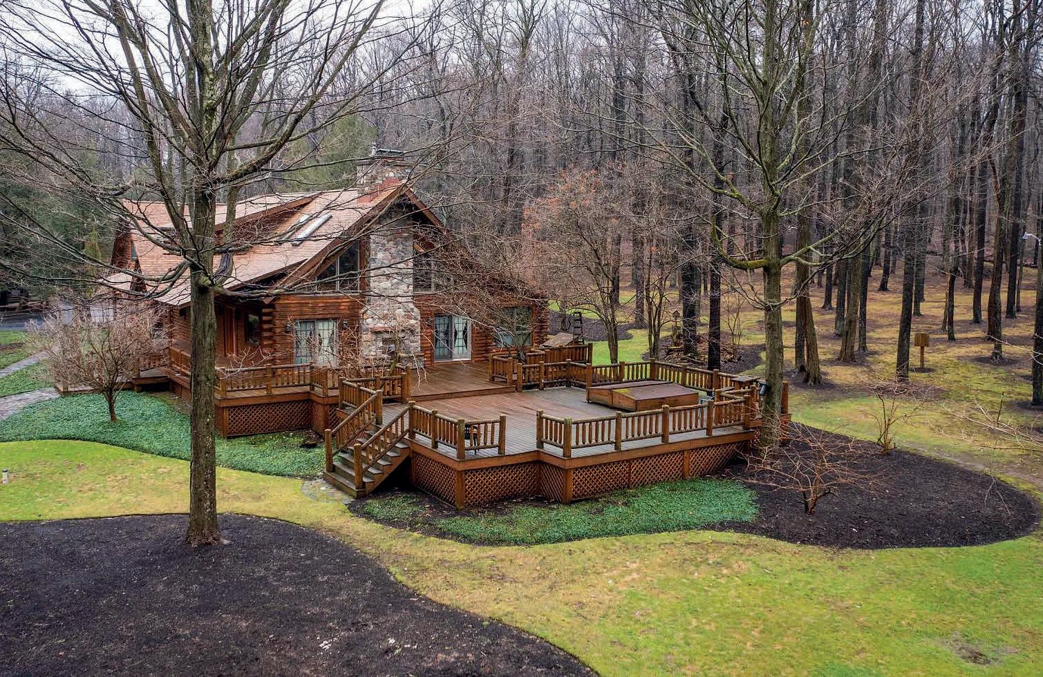 We are is pleased to present a special retreat to luxury and serenity in this 4,933 square foot one-of-a-kind custom built log home estate. Rarely do you find a property of this caliber with the additional desirable attribute of a prime location. Secluded privately in the hills near the popular Peek N Peak ski, golf and water sports resort, this property is the ultimate vacation destination or a forever home hide-a-way. 64.9 acres surrounds you with hardwoods, a 3.9 acre park-like yard, a stocked pond, and a home where wildlife abounds. Just minutes to Findley & Chautauqua Lake, the Chautauqua Institution and WNY wine country, outdoor enthusiasts will have additional recreational opportunities to enjoy in the near neighborhood of many Western New York relaxing destinations. This three level home boasts four bedrooms and three and a half bathrooms, comprising of a 2136 sqft main level, a 900 sqft upper level, and a bonus of 1897 sqft. of a finished lower-level basement for additional living space. A six car garage is attached for parking convenience and storage. If home entertainment and barbecue afternoons are in your plans, a 2,200 sq.ft. multi-level deck is part of this home and large enough for the biggest family or social gatherings under the shady trees. The deck also features a built-in hot tub. The pond is stocked with bass and other species of fish with a dock and shore side pavilion. Proximate to the custom-built home is a two story 7,000 sqft heated barn for more vehicles, more storage, recreational vehicles, and could easily be expanded for more living space for a second guest home in the popular barndominium style construction.