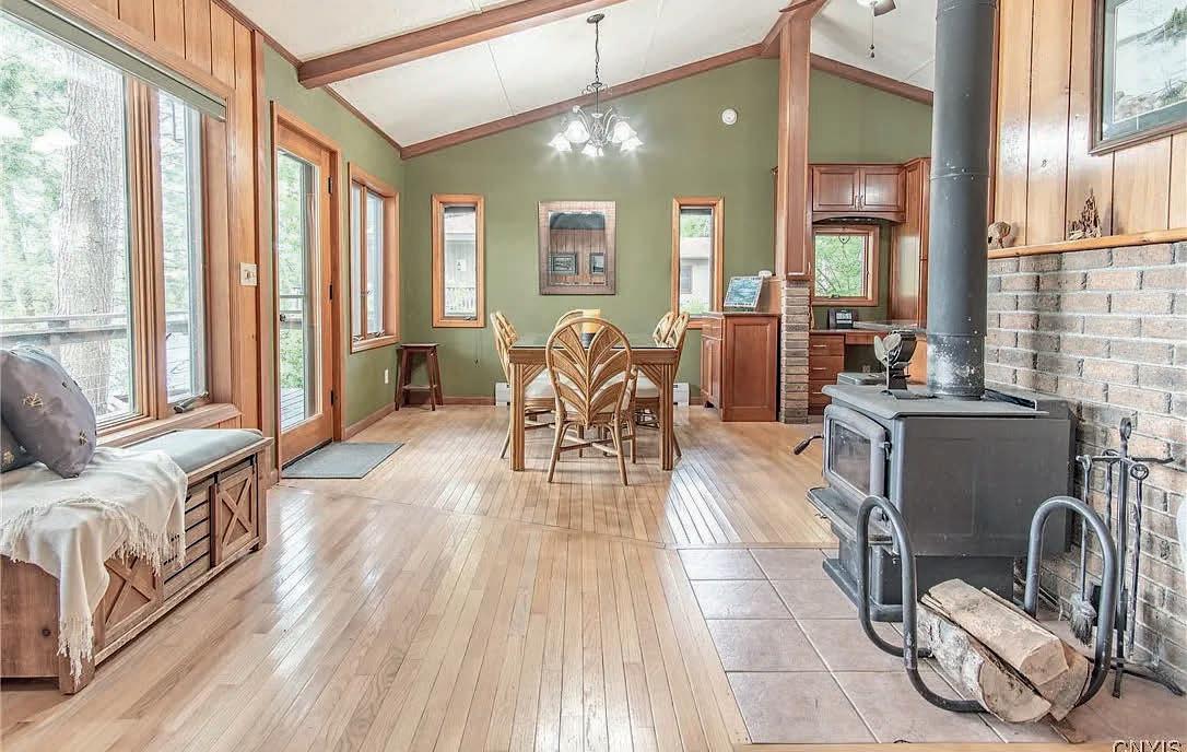 $345,000 | Features rich fabrics, handcrafted accents, a cozy enclosed porch with woodstove, and a workshop ideal for creative pursuits. Wood-burning insert, hardwood floors, garage, carport, and insulated storage container. Just minutes to town, dining, boat launch, and lake access