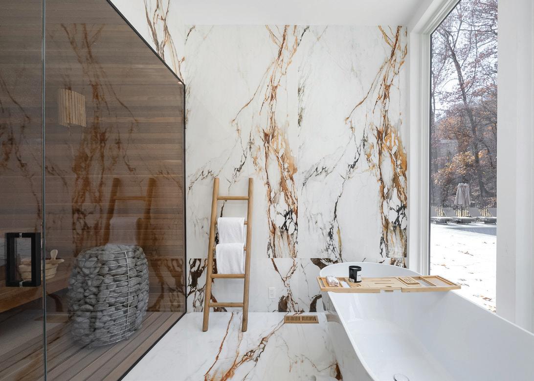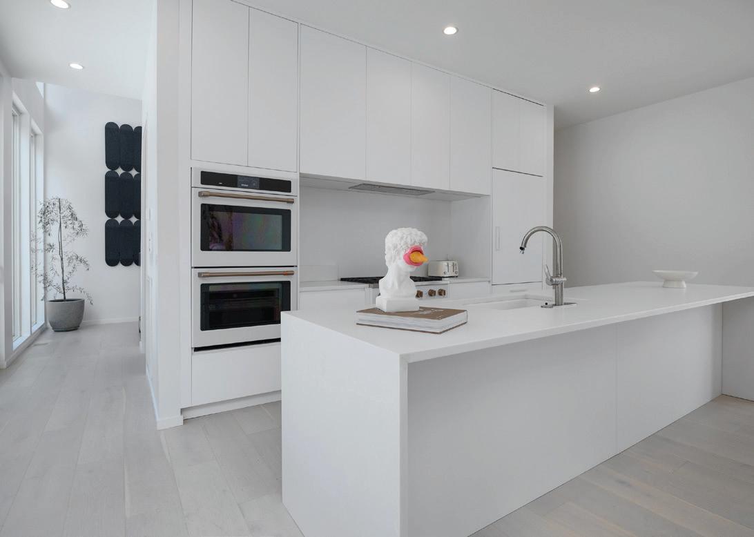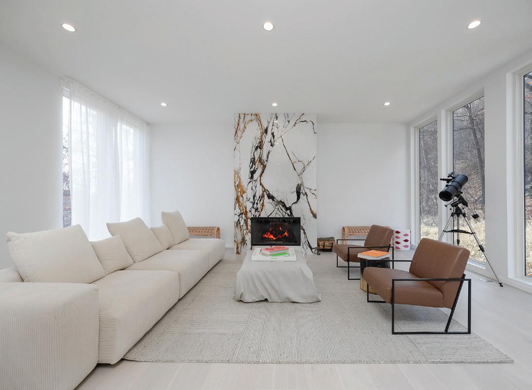 Completed in 2025 and sculpted into a landscape of dramatic natural rock formations, this architecturally significant modern residence offers the rare experience of total privacy paired with refined, design-forward living. Every element of this 3,564 sq ft home has been curated to deliver serenity, sophistication, and effortless luxury. The great room unfolds beneath 10-foot ceilings, framed by an entire wall of floor-toceiling glass that blurs the line between indoors and out. At its center, Porcelanosa-tiled wood-burning fireplace anchors the space with sculptural presence. The chef’s kitchen elevates daily life with custom cabinetry, a waterfall island, GE Café 6-burner gas range, double wall ovens, and integrated Bertazzoni appliances. The home features four private ensuite bedrooms, each crafted with spa-level materials. Bathrooms envelop you in Porcelanosa porcelain finishes, radiant heated floors, and refined fixtures—creating a quiet luxury experience throughout. A dedicated wellness wing includes a first-floor gym and a custom panoramic sauna and full bath, forming a personal retreat that rivals boutique resorts.