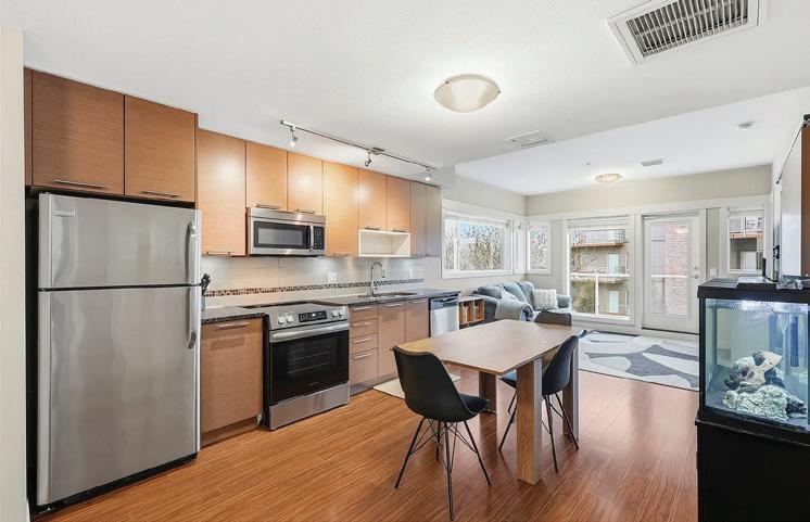 Beautiful townhouse-style condo with 2 exterior entrances & patio, overlooking a private pond with bridge to the popular walking path at Dockside Green. This spacious 2 bed plus den home features stunning floor-to-ceiling windows with reverse blinds, 9’8 high ceilings, bamboo flooring, granite counters, lightly lived in and shows as new. The Balance building at Dockside Green is LEED Platinum-Certified with green technology & environmental sustainability. Enjoy an unbeatable location close to Westside Village, Fol Epi, coffee shops, a yoga studio, dog parks, the Galloping Goose Trail, Songhees waterfront, bus routes, & only a 10 minute walk to downtown. Parking & storage included.