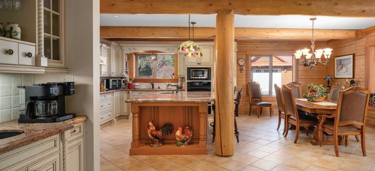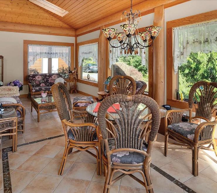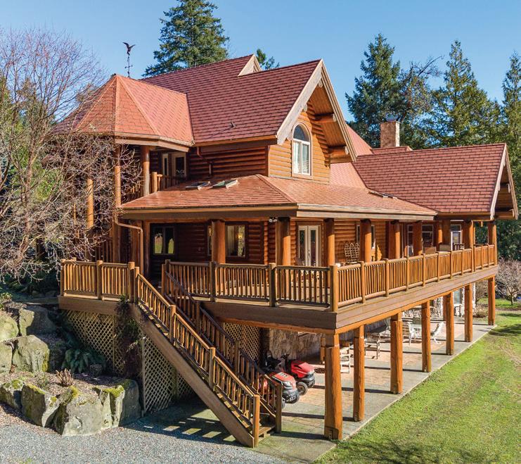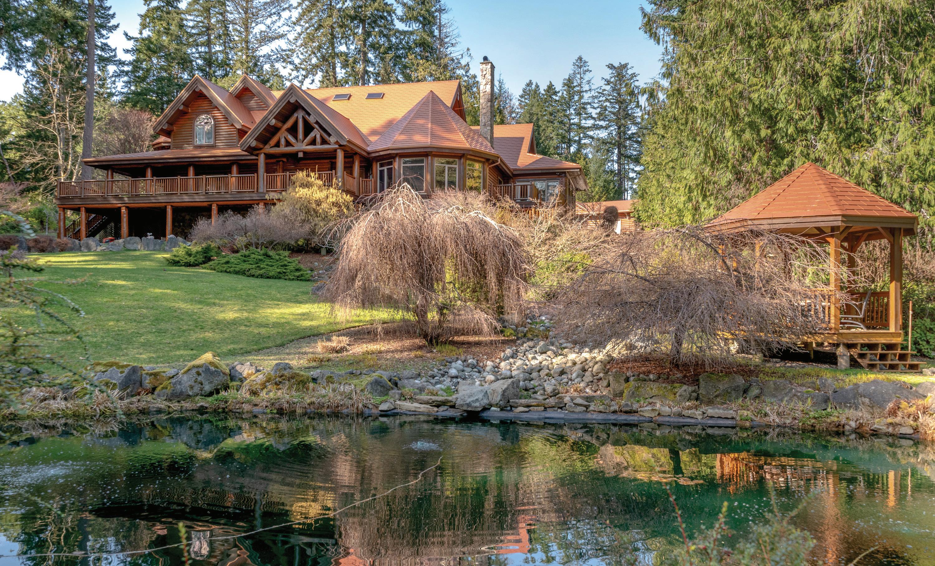 Quiet country living awaits in Aquila Estates with this impressive 8,200 Sq. Ft. custom Engelmann Spruce Log Home! Sited on 15 private acres of primarily forested property in coveted Yellow Point, just 15 minutes to Nanaimo or Ladysmith. Exceptionally finished throughout, the residence features an elegant great room with beautiful granite counters in the lavish gourmet kitchen and a generous dining area with enough space for the largest of gatherings! The dramatic 22’ vaulted ceiling in the main living room is anchored by a grand stone wood fireplace. Providing expansive entertaining spaces designed for gatherings large and small. The bright, south-facing large decks and patio areas frame the picturesque pond and landscaped park-like backdrop. A setting for serene outdoor living and seamless indoor-outdoor flow. The generous footprint includes three bedrooms (could easily be more) all with their own ensuite including a huge primary suite boasting its own oversized ensuite with separate shower and indulgent soaker tub. The efficient systems in the home include in-floor radiant heat, a pellet stove and wood burning fireplace. Approximately three acres are cleared for gardens, hobby farming or recreation, a gazebo plus an RV site with power adding practical flexibility. With quiet country elegance, meticulous finishes, abundant storage and versatile rooms, this property blends classic log-home character with contemporary style for year-round entertaining, quiet retreats, and future expansion.