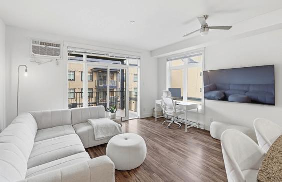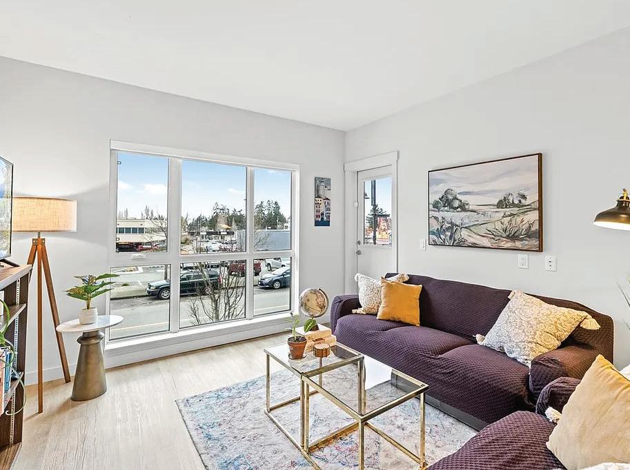 Welcome to Unit 102 at 1110 Samar Cres, a rare corner residence offering exceptional privacy, scale, and outdoor living in the heart of Langford. Ideally positioned near the building entrance with only one common wall, this quiet home is flooded with natural light thanks to extra-large windows and impressive 15-ft exposed concrete ceilings. Motorized blinds add both convenience and a modern touch throughout. The thoughtful layout includes a spacious den—perfect for a home office or guest space—along with walk-in, side-by-side laundry, dedicated storage, and a high-efficiency ERV system for improved air quality and year-round comfort. Enjoy true indoor-outdoor living with over 600 sq ft of private patio space, ideal for entertaining, pets, or relaxing while taking in peaceful mountain views. This home includes two EV rough-in parking stalls, with the additional stall valued at $20,000—an increasingly rare and valuable feature. Located in a walkable, wellconnected Langford neighbourhood, you’re just minutes to parks, trails, shopping, restaurants, schools, and major commuter routes, while still enjoying a quiet residential setting. Whether you’re downsizing, investing, or seeking a unique west shore lifestyle, this home delivers space, design, and long-term value.