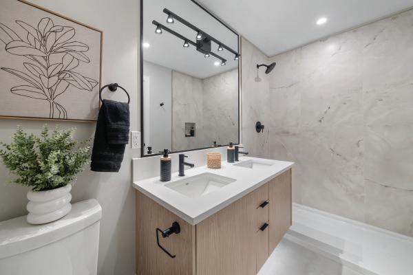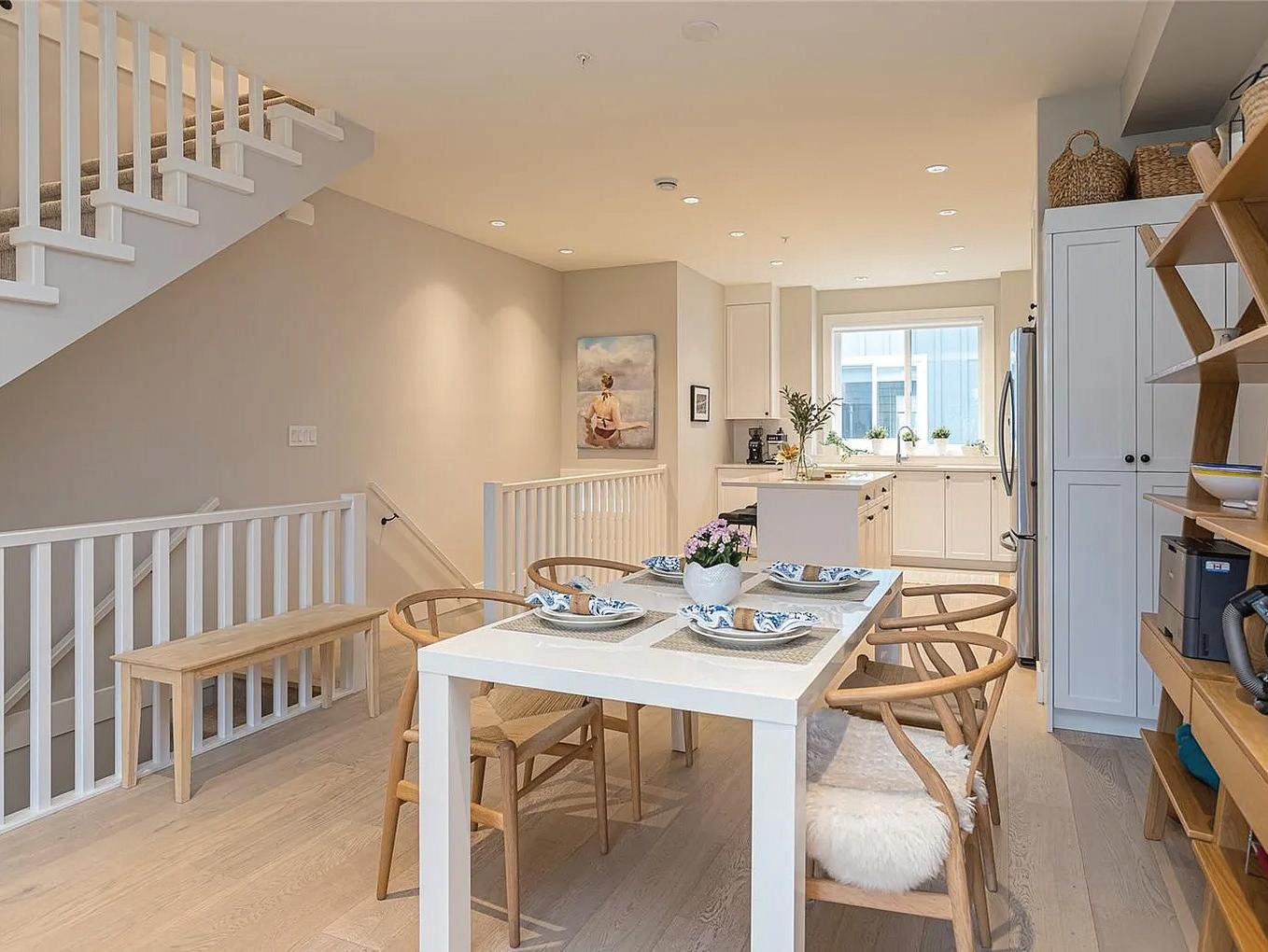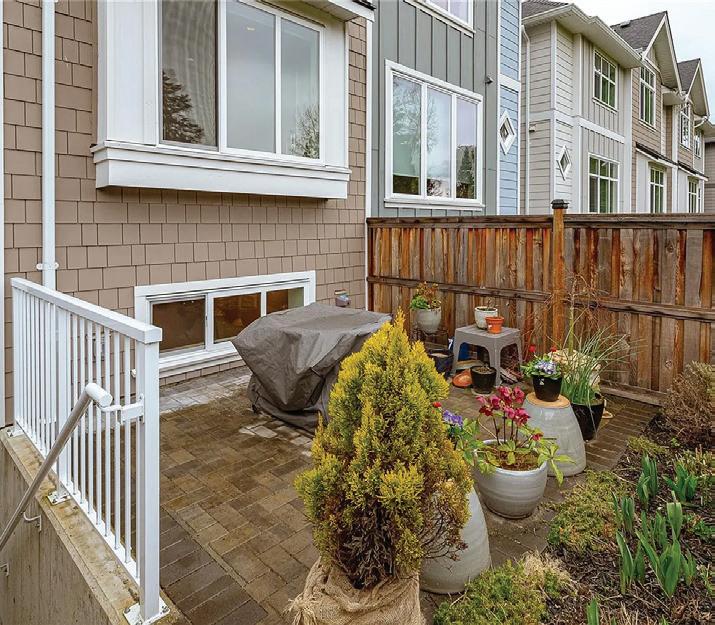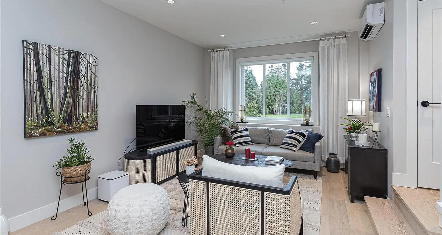 Tucked away on the quiet side of the complex and backing directly onto Melville Park, this nearly new 3-bedroom, 4-bathroom townhome offers privacy, green space, and exceptional walkability. The smart layout features two upper-level bedrooms, each with its own ensuite, plus a third bedroom and full bathroom on the lower level—ideal for guests, teens, or a home office. The bright main floor features 9’ ceilings, large windows with peaceful park views, quartz countertops, full-height cabinetry, and a spacious island for entertaining. Enjoy year-round comfort with an efficient ducted heat pump and wall unit for heating and cooling. A sunny, south-facing fenced patio provides the perfect space for gardening or relaxing. Heated bathroom floors, full-size laundry, a powder room, and an oversized EV-ready garage add to the home’s appeal. Walk to schools, the beach, oceanfront trails, and downtown Sidney in minutes.