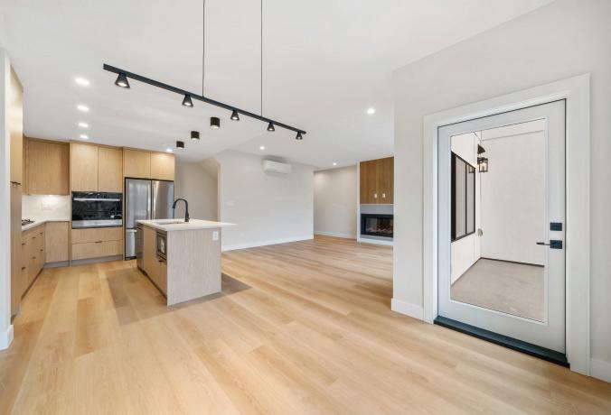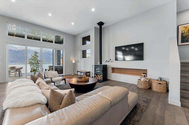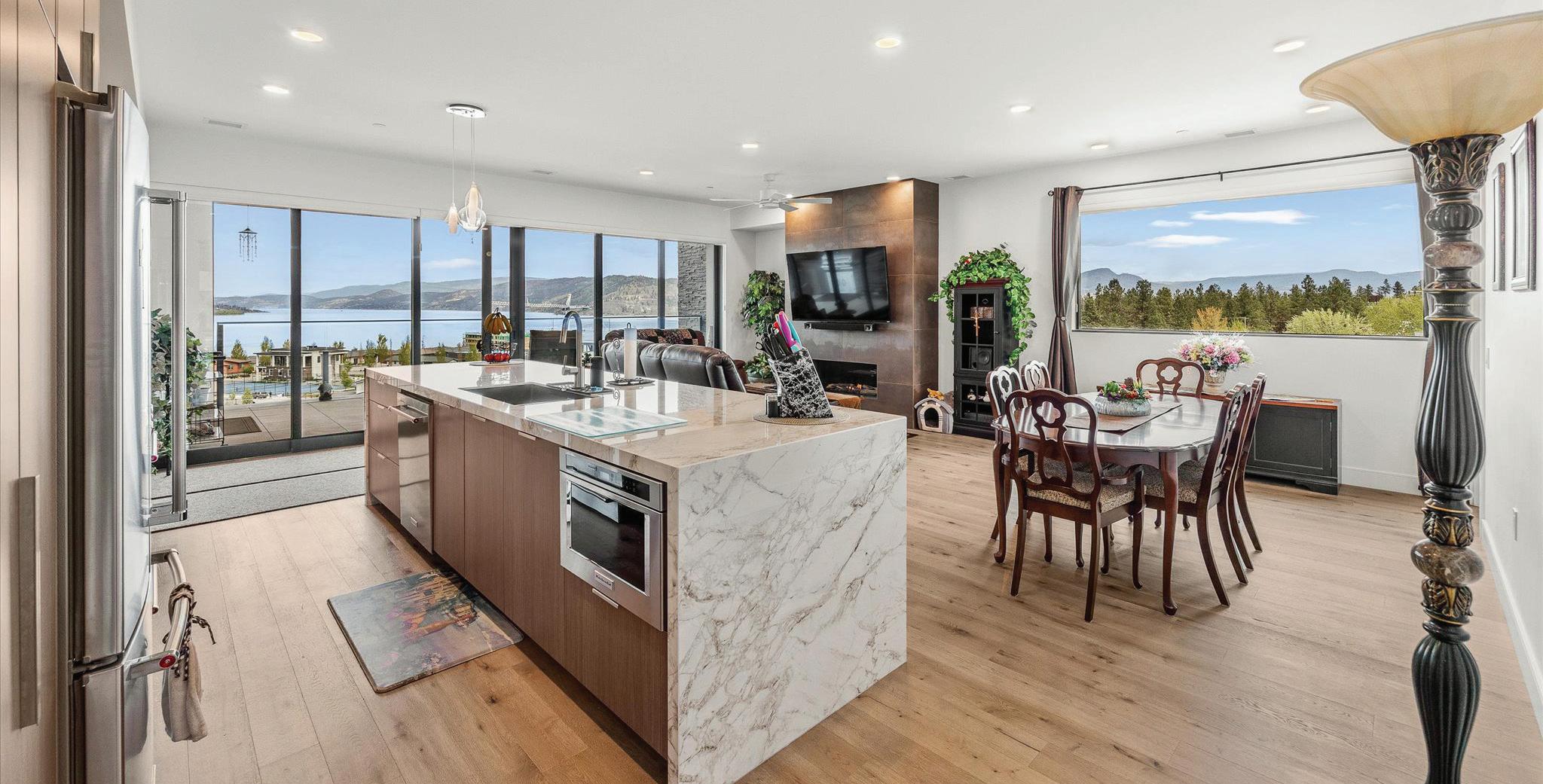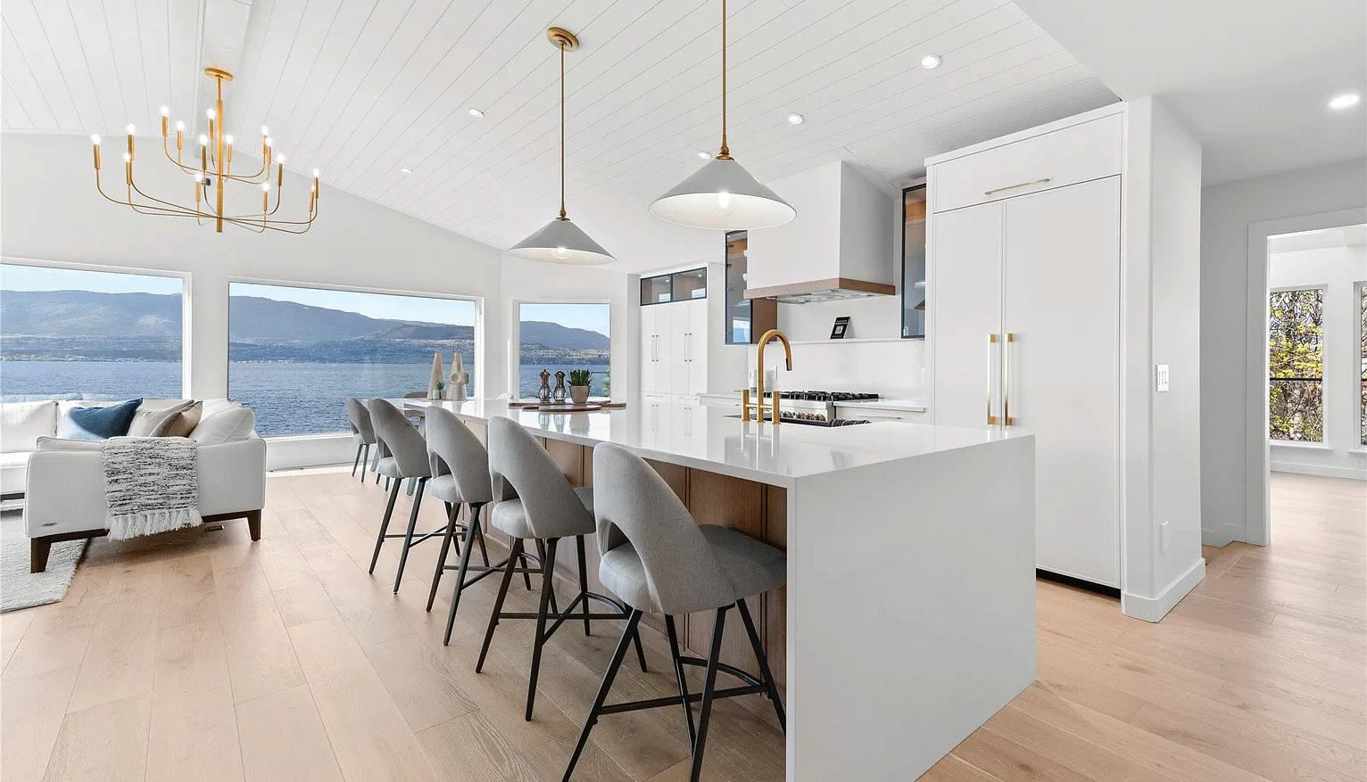 Set on a quiet no-through road in McKinley Beach, this contemporary residence offers a rare sense of privacy paired with uninterrupted views of Okanagan Lake. Designed across three levels, the home showcases soaring ceilings, wide-plank hardwood floors, and expansive walls of glass that capture sweeping lake and mountain vistas. The main level is anchored by a dramatic great room with a wood-burning stove and floor-to-ceiling windows, seamlessly connecting to the chef’s kitchen. Here, an eight-burner Fisher & Paykel gas cooktop, dual Bosch wall ovens, oversized island, and full butler’s pantry with built-in appliances makes entertaining effortless. The dining area opens to a covered deck with glass railings, in-ceiling heaters, and integrated speakers, an inviting space to enjoy the view year-round. Two bedrooms with a shared bath located on this level. MLS® 10373918
