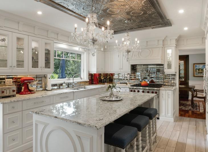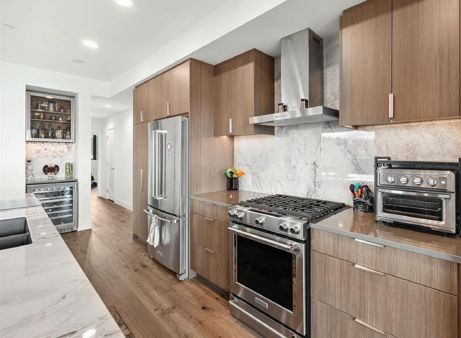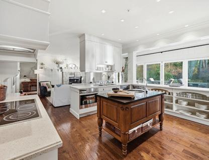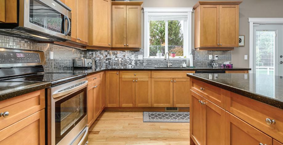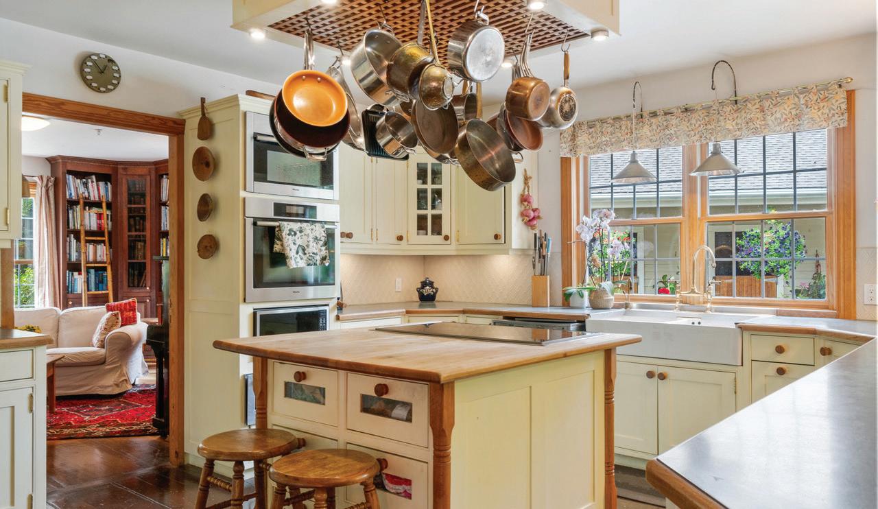 The gourmet kitchen is beautifully appointed with cherry wood cabinetry, granite countertops, and generous workspace, perfect for both quiet mornings and effortless entertaining.