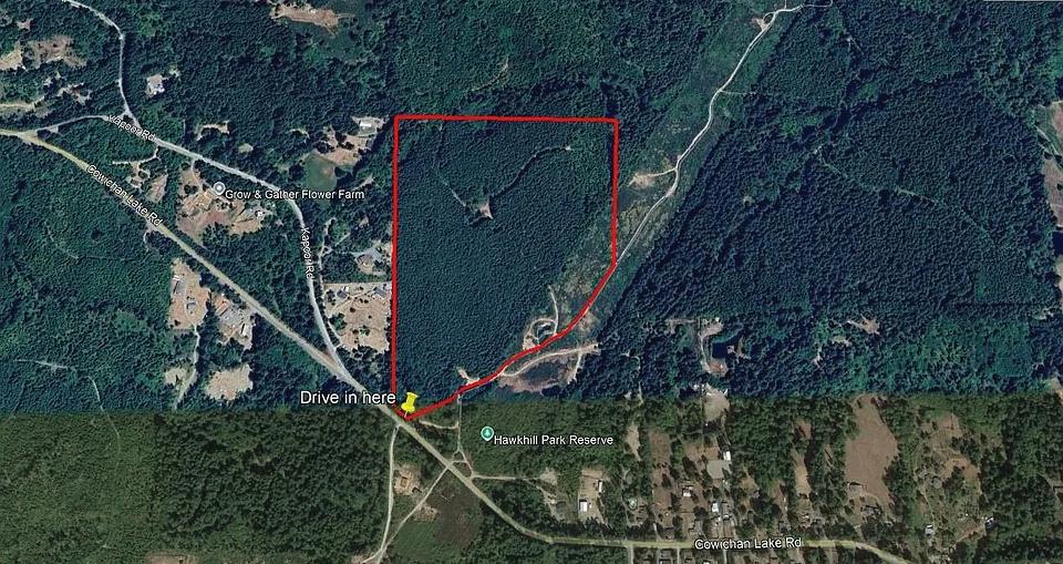 Foreign buyers Eligible. Five + acre property set back from the road. Seasonal stream & Large pond with water license. Near proposed Paldi Village. Power to building site. The land Gently slopes to the south. Very sunny & Warm Here. Zoning allows a main home and a smaller 2nd home or suite. Some of the property is under hydro lines with other areas of very nice natural setting. Very private. Area under power lines can be Tree farm or other crops under 10’ high. Might be a good Vineyard or Garlic Farm? Will need water source & Septic System. GST applicable - not included in purchase price. Approximate address is 5055 Cowichan Lake Rd for Google Maps. Transit bus goes by here.