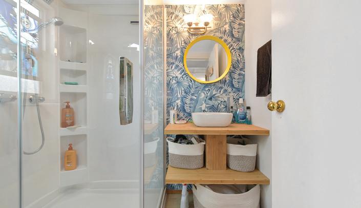 Three bedrooms, each with their own ensuite, are thoughtfully positioned along the oceanfront side of the home, all opening directly onto an expansive wraparound deck. The primary suite is a private retreat, complete with a spa-inspired bath, walk-in closet, leather flooring and its own quiet connection to the outdoors.