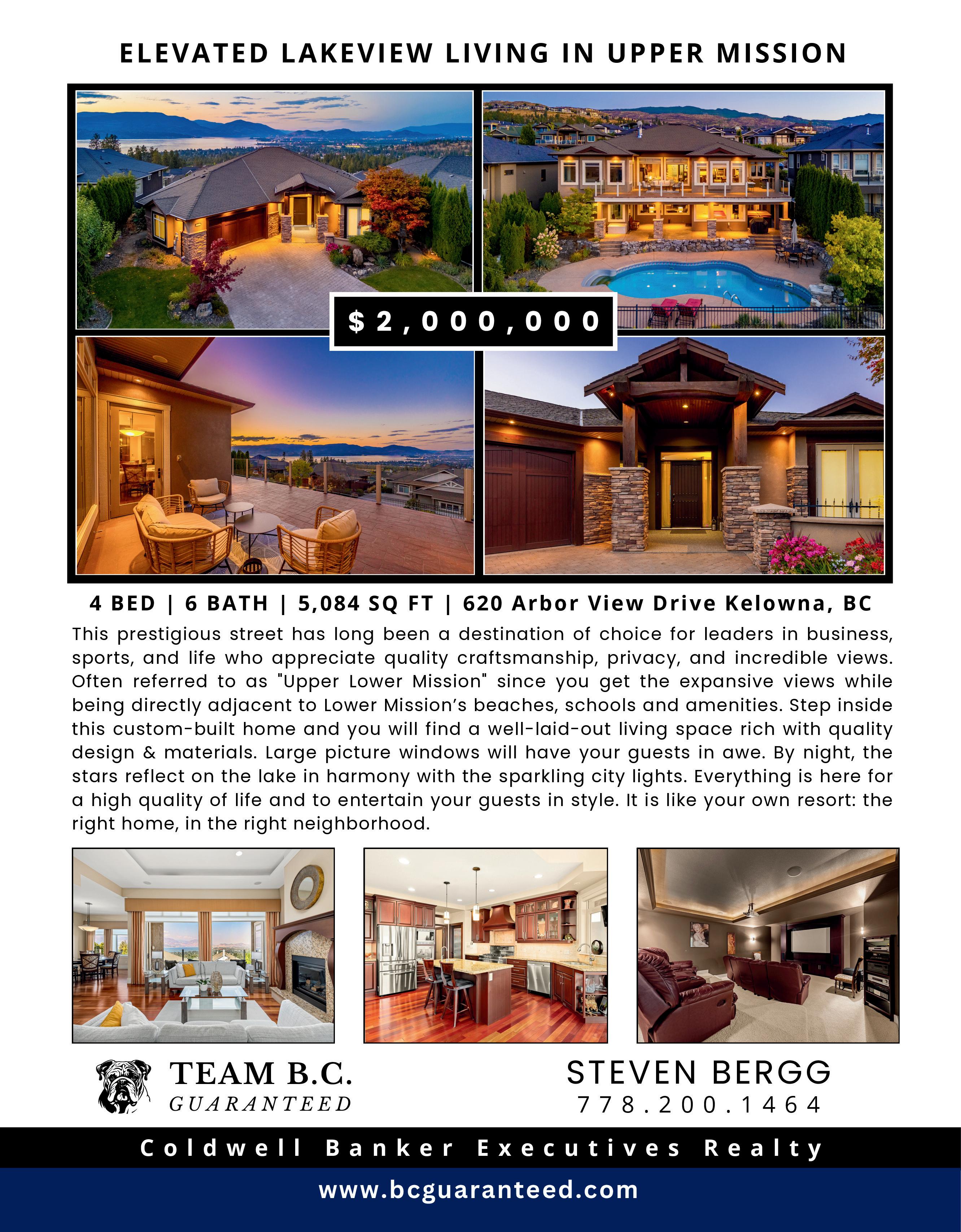 Perched on a quiet cul-de-sac, this custom-built home by award-winning Vineyard Developments captures unobstructed panoramic views of Okanagan Lake, the bridge, and the twinkling lights of Kelowna and West Kelowna. Designed for privacy and presence, this 5-bedroom, 4-bath residence blends timeless materials with modern comfort on a generous lot with room to add a pool. MLS® 10376157