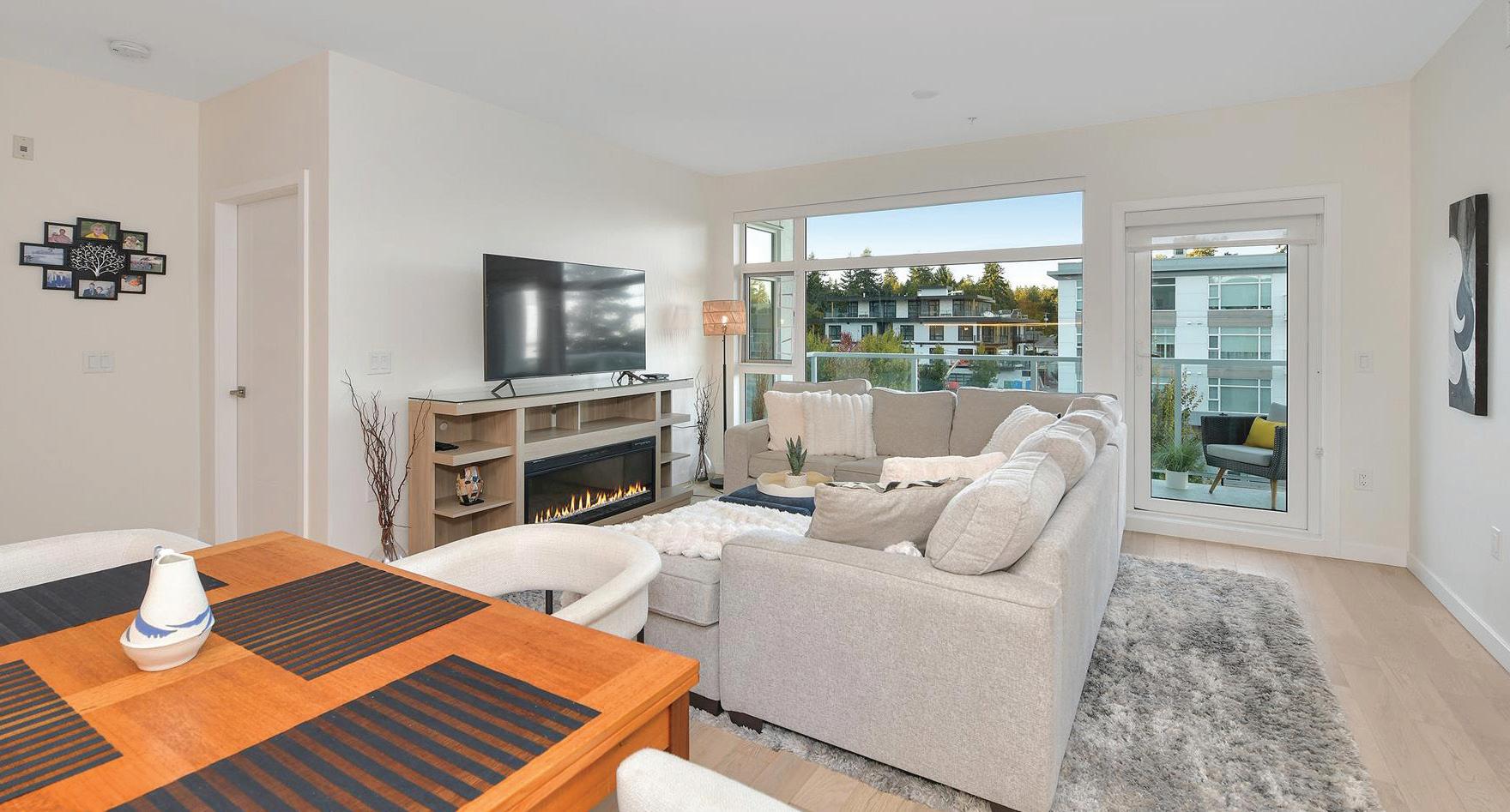 Bathed in morning light with south-east exposure, this top-floor corner home at Eliza feels bright, uplifting, and beautifully refined. High ceilings and expansive windows frame ocean and mountain views, while elevated contemporary finishes — including stainless steel appliances, custom cabinetry, and quartz counters — create a sleek, modern aesthetic. Royal Bay community with cafés, groceries, schools, and the beach just moments away. Petfriendly and move-in ready, with GST