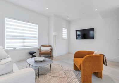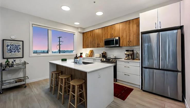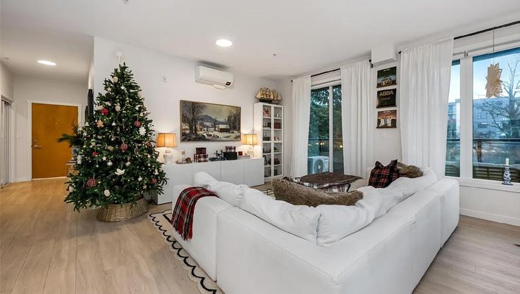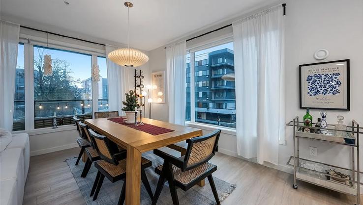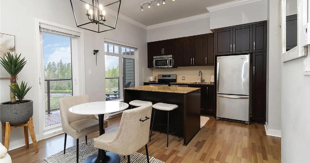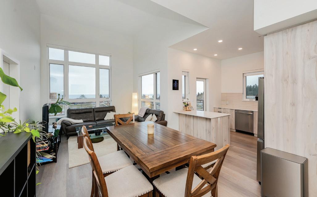 Bathed in morning light with south-east exposure, this topfloor corner home at Eliza feels bright, uplifting, and beautifully refined. High ceilings and expansive windows frame ocean and mountain views, while elevated contemporary finishes — including stainless steel appliances, custom cabinetry, and quartz counters — create a sleek, modern aesthetic. Royal Bay community with cafés, groceries, schools, and the beach just moments away. Pet-friendly and move-in ready, with GST