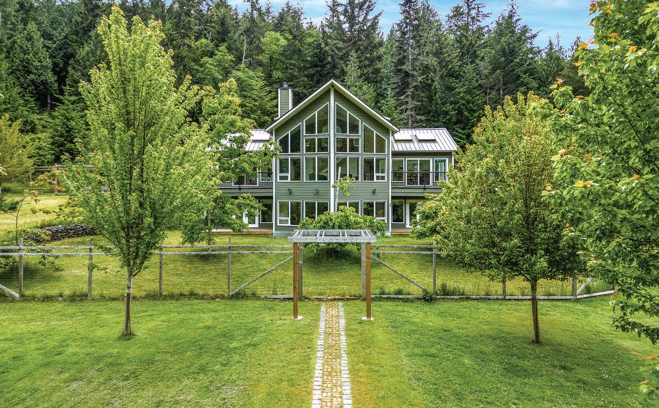 Appealing West Coast contemporary home on 6.97 acres of sprawling gentle terrain with much potential for a hobby farm and orchard. Swimmable pond, underlying services to power, water, drainage, & sewage for easy connection to auxiliary buildings, garage and a 2nd cottage. Open plan design, expansive floor to ceiling windows, vaulted ceilings, stone fireplace, spacious kitchen and dining. Primary bedrm with 4 pce ensuite, 3 pce guest bathroom, laundry & boot room with a doggie shower complete the main floor. Loft with views to the outdoor green space. Lower level is conveniently set up for guests and could easily become a bed & breakfast retreat or suite; cozy family room, 2 bedrms w/ensuites, office, large utility room, and many outdoor seating areas that surround this lovely home!
