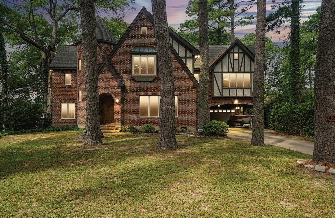 Nearly an acre of waterfront living frames this 3,865-sq-ft Tudor-inspired home, offering 4 bedrooms, 4 baths, and exceptional potential. The home blends timeless architecture with modern updates, including an open kitchen and great room with a gas fireplace, Anderson windows, and sweeping sunset views. One spacious bedroom with a private entrance awaits your finishing touch. An oversized two-car garage, workshop, and carport provide abundant storage, while the grounds offer tranquil natural surroundings, direct water access, and space to craft your ideal outdoor retreat. With many original plans and no flood insurance required—this is a rare chance to customize a stately waterfront property in a remarkable setting.