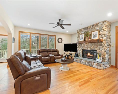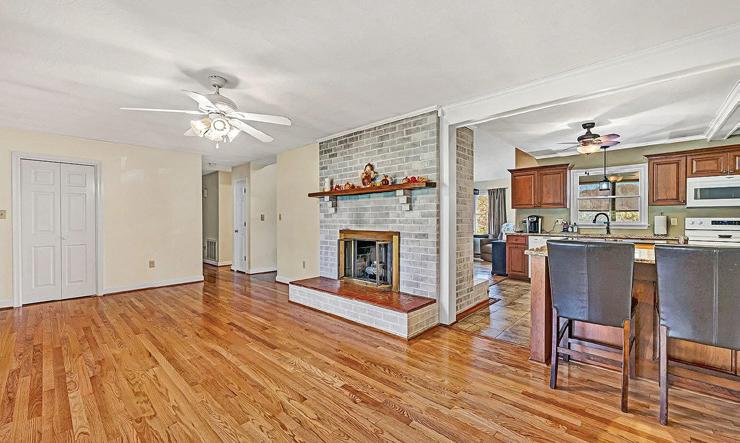 Inside, you’ll find restored poplar and pine floors, slate tile, designer paint, and a stunning staircase leading to the bedrooms. Gas log double fireplaces warm the living and dining areas, while updates include newer windows, garage doors, concrete pad, solid wood interior doors, two AC units, and a 2-year-old water heater. Septic recently inspected and pumped.