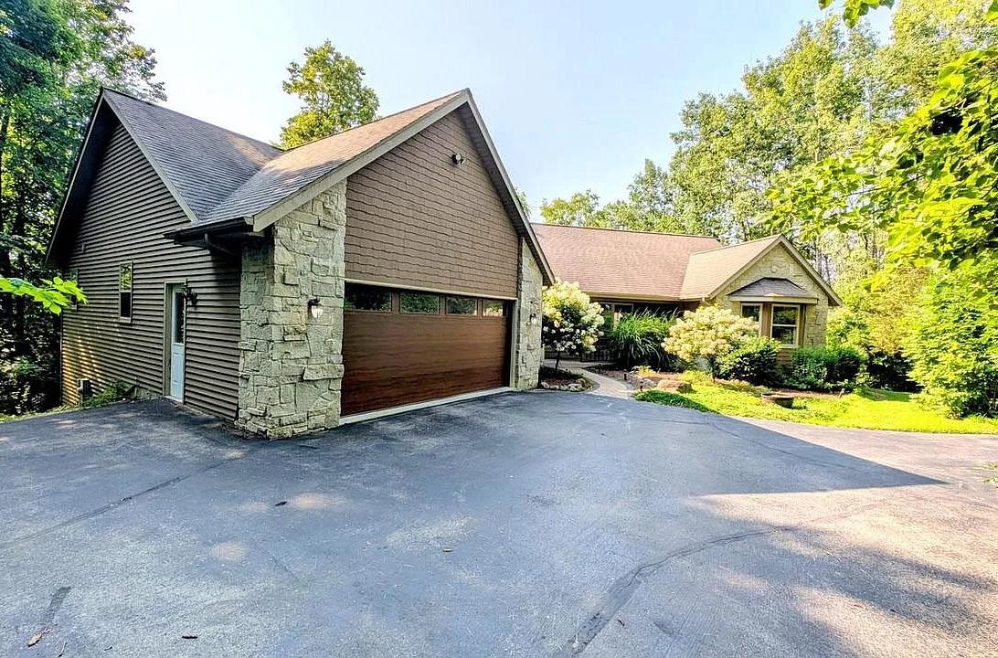 Step into your dream home, a beautifully landscaped oasis set on over two acres. You’ll love the vaulted ceilings and the expansive living spaces across multiple levels, including a rec room, living room and a bonus room over the garage. The primary suite offers a serene view of the open concept design, and the full walkout basement is perfect for entertaining. The recently stained deck is ideal for enjoying coffee or observing nature. The interior shines with fresh paint throughout and a unique pallet board wall in the bonus room. Significant exterior improvements include the removal of the old back deck and new siding and insulation on the back of the house. Centrally located between Lake Redstone and Dutch Hollow Lake. Only 30 minutes from Wisconsin Dells and all of the amenities.