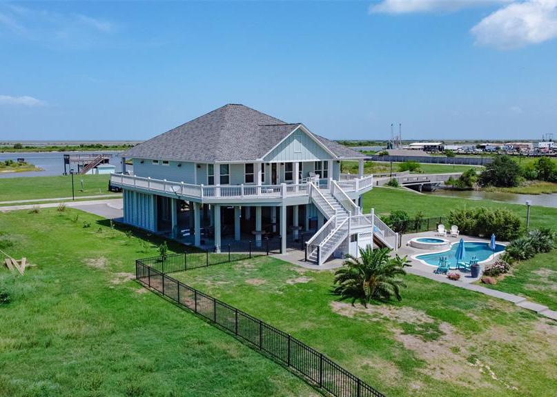 Gorgeous custom home in the gated water front community of Laguna Harbor w/inspirational views! Located a few minutes from the GalvestonBolivar ferry, this community provides immediate access to Galveston Bay & Gulf of Mexico & you can securely dock your vessel in your own backyard. Whether you are an inshore or offshore fisherman, a yachtsman, a sailor, or just in need of some peace and quiet, this place is ready to make it your own! The home provides a unique, high-quality living experience, including a solid concrete bulkhead on the canal, new kitchen appliances, an automatic Generac generator w/500 gal. propane tank, wrap around deck, fiberglass pool & hot tub, built in wine cooler, inline water heater, 2 primary bedroom closets & an outside rain shower. Plenty of room to entertain downstairs in the built in bar area w/a place to prepare your fresh catch of the day. You can also hop in your car and be at the beach in just a few minutes. This is is the Port You’ll Call Home!