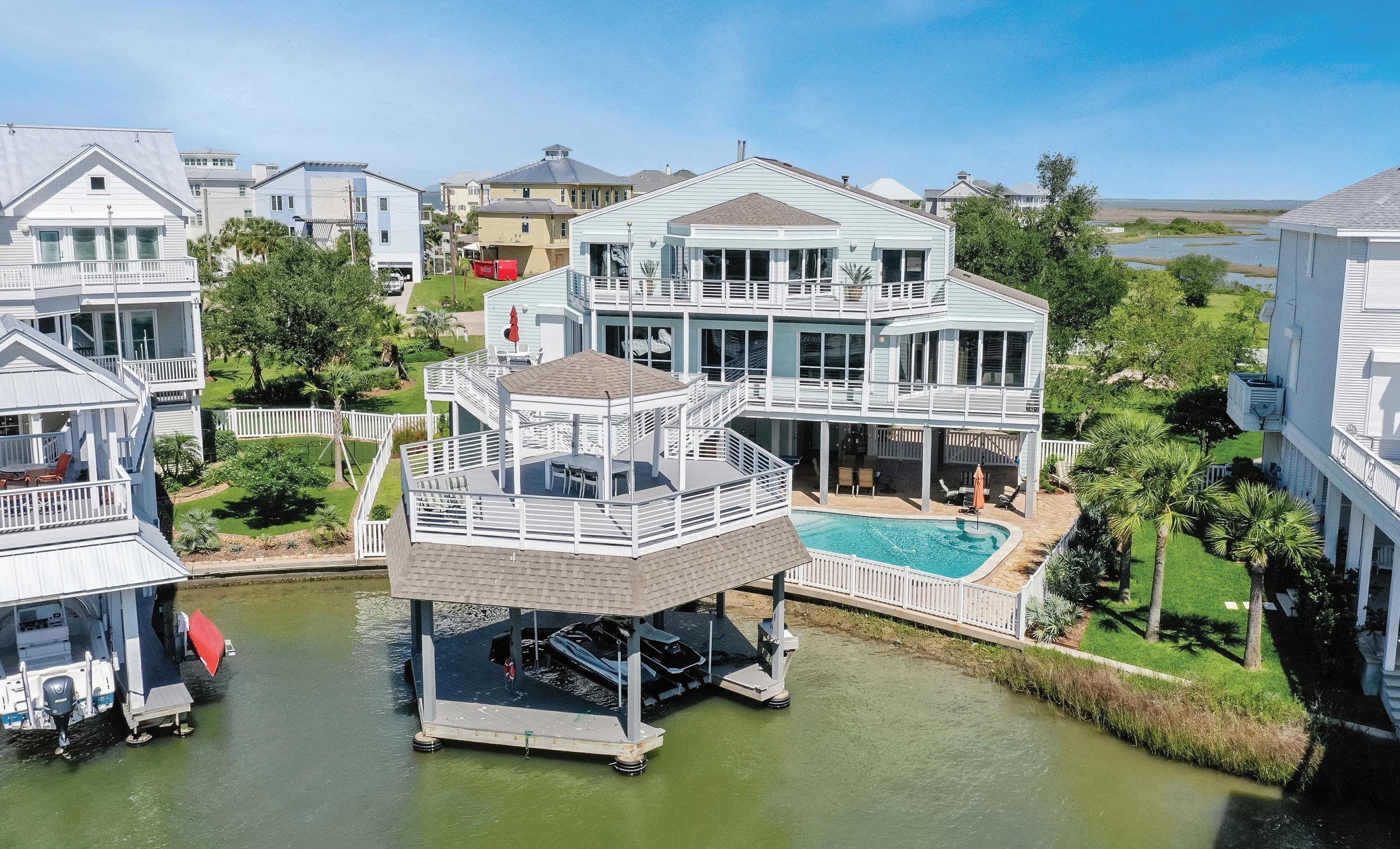 Captivating Bayfront home offers panoramic views of Galveston Bay from multiple balconies and fabulous covered living area and salt water pool and spa. The domed foyer and grand staircase welcome you to this remarkable home that was designed for entertaining on a large scale. A central Great Room is open to the chef’s island kitchen, dining and breakfast areas. Game room complete with bar and wine cellar. Primary suite is a must see with its’ private balcony, spectacular bath, extensive his and hers closets and home gym. There are three additional guest suites w en suite baths and large closets. Third floor study. The outdoor living area is 24 x 74 complete with fireplace, DCS grill and rotisserie, 2 dishwashers, pool bath, large dining space and TVs. Elevator. 22 KW Generator. Workshop. Built by Harbour Classics. Control 4 audio, Pool, AC, Security controlled by app.