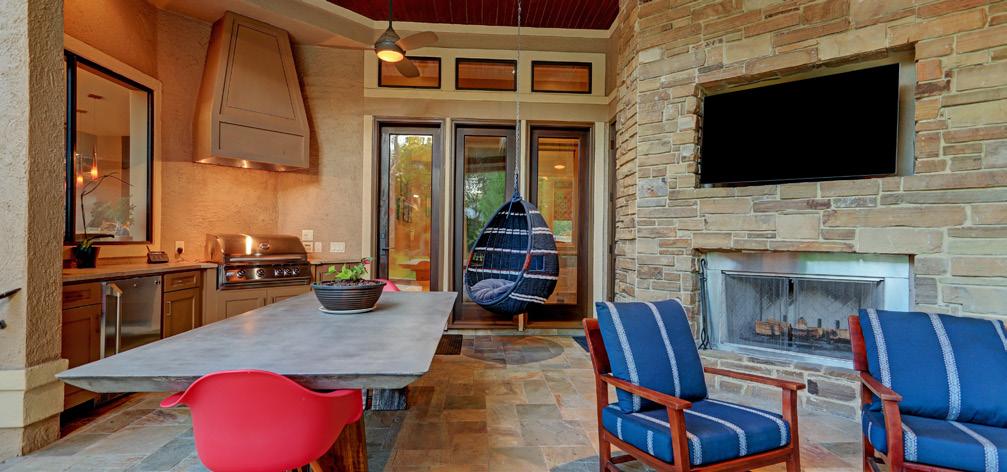 outdoor living room & deluxe kitchen are complete with wood-burning pizza oven, gas grill, wet-bar, cascading fountain wall & outdoor FP!!