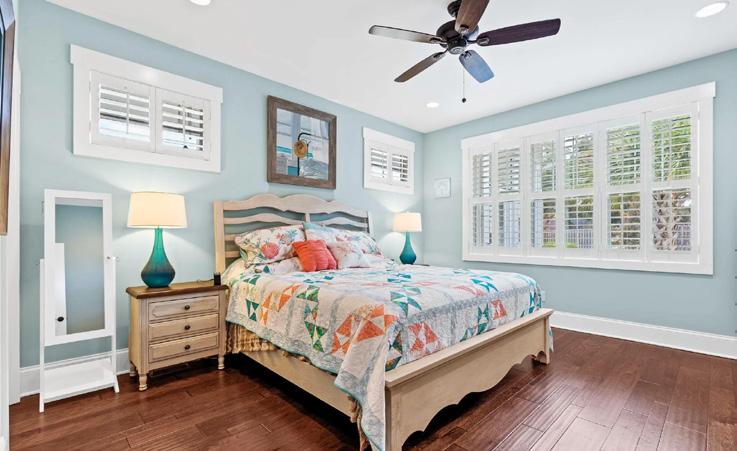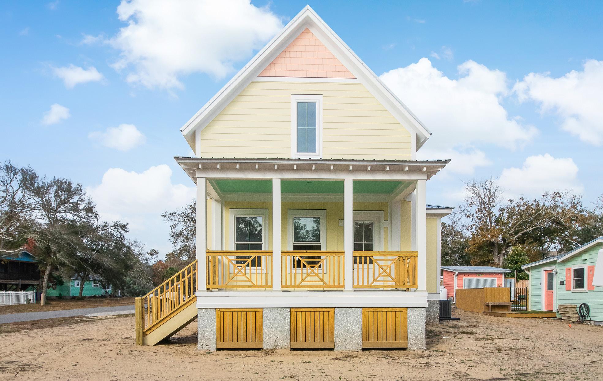 This cheery beach cottage is full of whimsical details and sits oh so pretty on a beautiful corner lot. With a mix of sunny yellow board & batten, lap siding and coral shake accents, a tabby shell concrete foundation and metal roof, she’s sure to catch your eye. The front and back porches feature distinct details such as exposed rafter tails and aqua colored ceilings and the back porch will be screened in with composite decking. Step inside and find stunning 6’’ prefinished white oak floors throughout the main level. In the kitchen are striking white shaker cabinets with a bright glass tile backsplash that catches your eye as you take in all the thoughtful details. Brass accents shine throughout the home as well as the cove crown molding. Conveniently located on the main level is the primary bedroom with walk in closet and a bathroom that will make you do a double take. You’ll find a double vanity complete with large mirror above, designer sconces and a linen cabinet for great storage. The star of the show is the custom tile shower – stripes of white and aqua penny tile add to the whimsey. In the stairwell, natural light pours in from the dormer windows keeping it bright and cheery everywhere you look. On the upper level, you’ll find 9’ ceilings with two large guest bedrooms and a guest bathroom. Other details you’ll want to take note of include 9’ ceilings on the main level, a tankless electric water heater, ceilings fans in all bedrooms and living room, recessed can lights throughout, and a stacked washer and dryer. The builder has also included spray foam Icynene insulation for the entire home including the crawl space, walls and attic so that all areas will have the same temperature as the interior temperature, creating a better environment for the heating and air systems and added comfort and noise reduction; an Aprilaire Crawlspace dehumidifier providing a moisture free crawlspace in a high humidity environment and a Trane Heating and Cooling system with supply to the crawlspace. At just over 1600 sq ft, this dreamy home has space to spread out and generous porches to enjoy beach life as well.