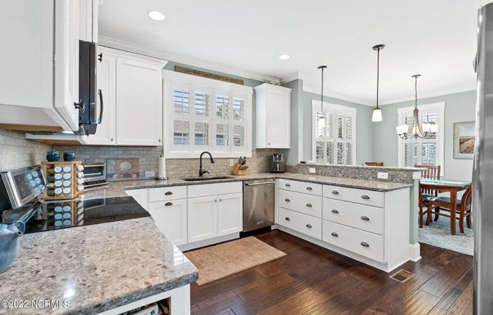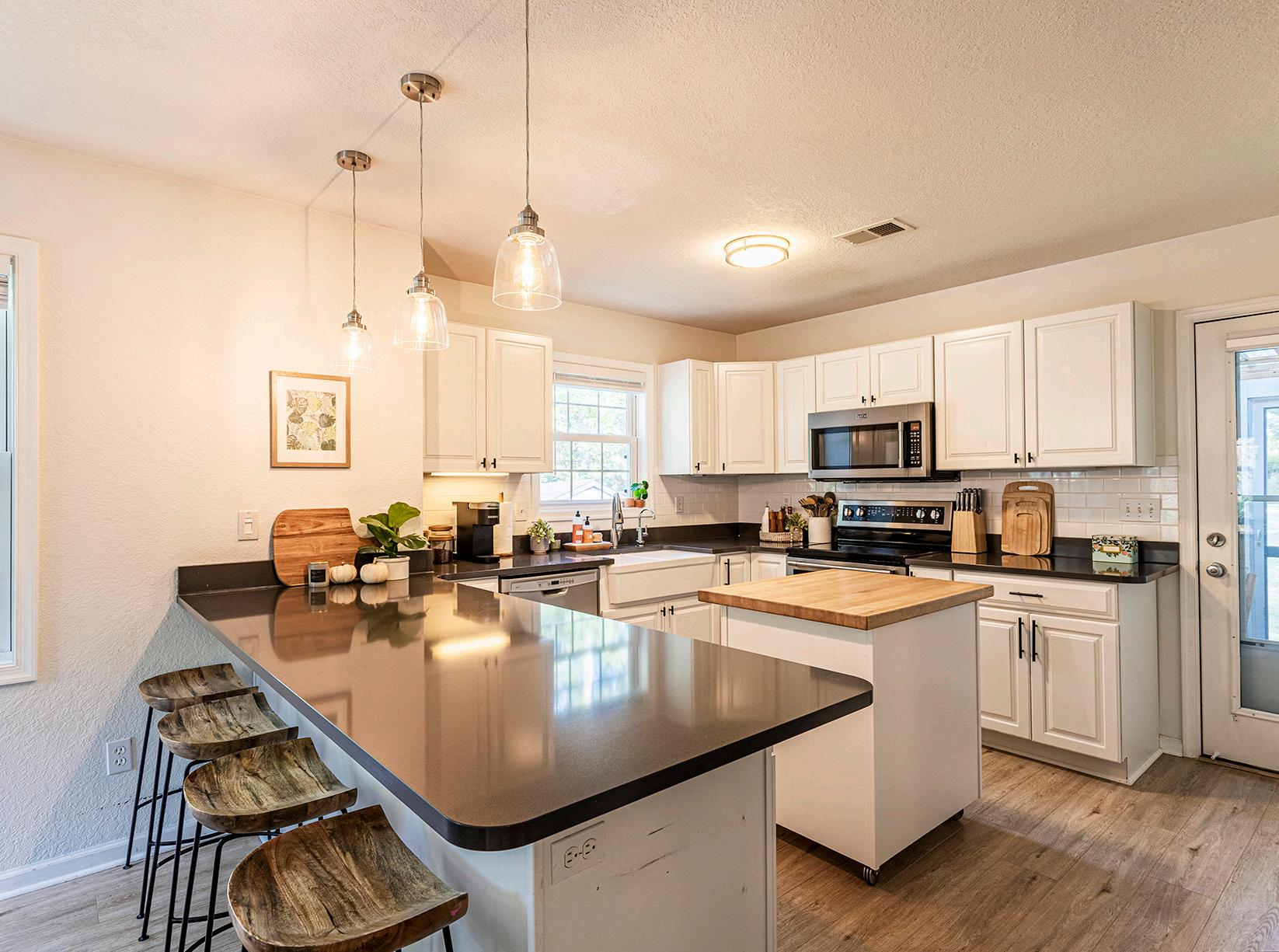 5201 WINSOR PLACE KITTY HAWK, NC 27949 $549,000 | 4 BEDS | 2 BATHS | 1,674 SQFT 5201 Winsor Place is truly a gem, located in beautiful Kitty Hawk Estates, OBX. Raised ceilings above the fireplace are at the center of this almost completely updated home. Luxury vinyl flooring runs throughout. Stainless appliances compliment the subway tile backsplash in the kitchen, complete with the farmhouse sink and soft-close cabinets. Formal dining room abuts the kitchen with spacious quartz countertops and plenty of seating.