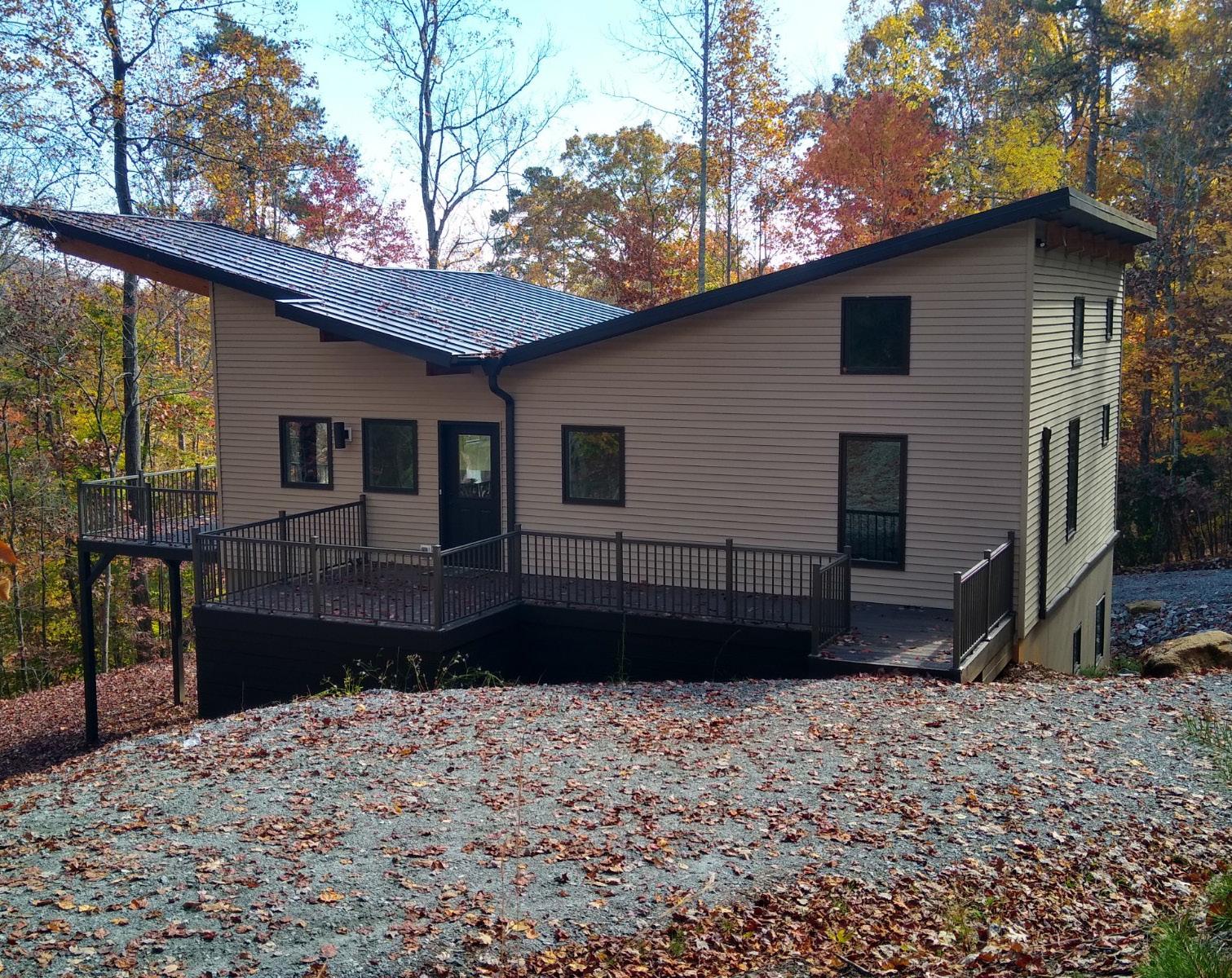 Move In Ready! Very Unique, Mid-Century Modern “Butterfly-Roof” house design by American Woodlands Design Studio with 3-bedrooms & 3-full bathrooms plus a 1 car oversized garage, nestled in the forest on a 1.98-acre estate lot, on a quiet, non-thru street, inside the main gate of Rumbling Bald Resort near all amenities. Vaulted ceilings throughout with lots of windows to let in natural light. Open Floor Plan allows plenty of room for cooking and entertaining. Kitchen has an oversized island, quartz countertops, soft close cabinets, and new stainless-steel appliances including a wine-frig, plus a large walk-in pantry. Spacious Master Suite on main floor with double closets and elegant En-Suite bathroom with vaulted ceilings, double sink vanity, granite rock floors and large walk-in tile shower. Split-plan Bedroom #2 and full tiled hall Bathroom #2. Downstairs has 10 ft ceilings; Bedroom #3 or Living Area with a full bath; A Bonus Room; Laundry with new washer and dryer; This energy efficient build was completed in 2022 and includes Superior Walls Foundation; 6” exterior walls; Insulated steel roof by Thermasteel; 2-zone split air conditioning by Carrier; 50 year standing seam metal roof by McElroy.; Adjacent Lots #1 and #4 are also available for purchase.