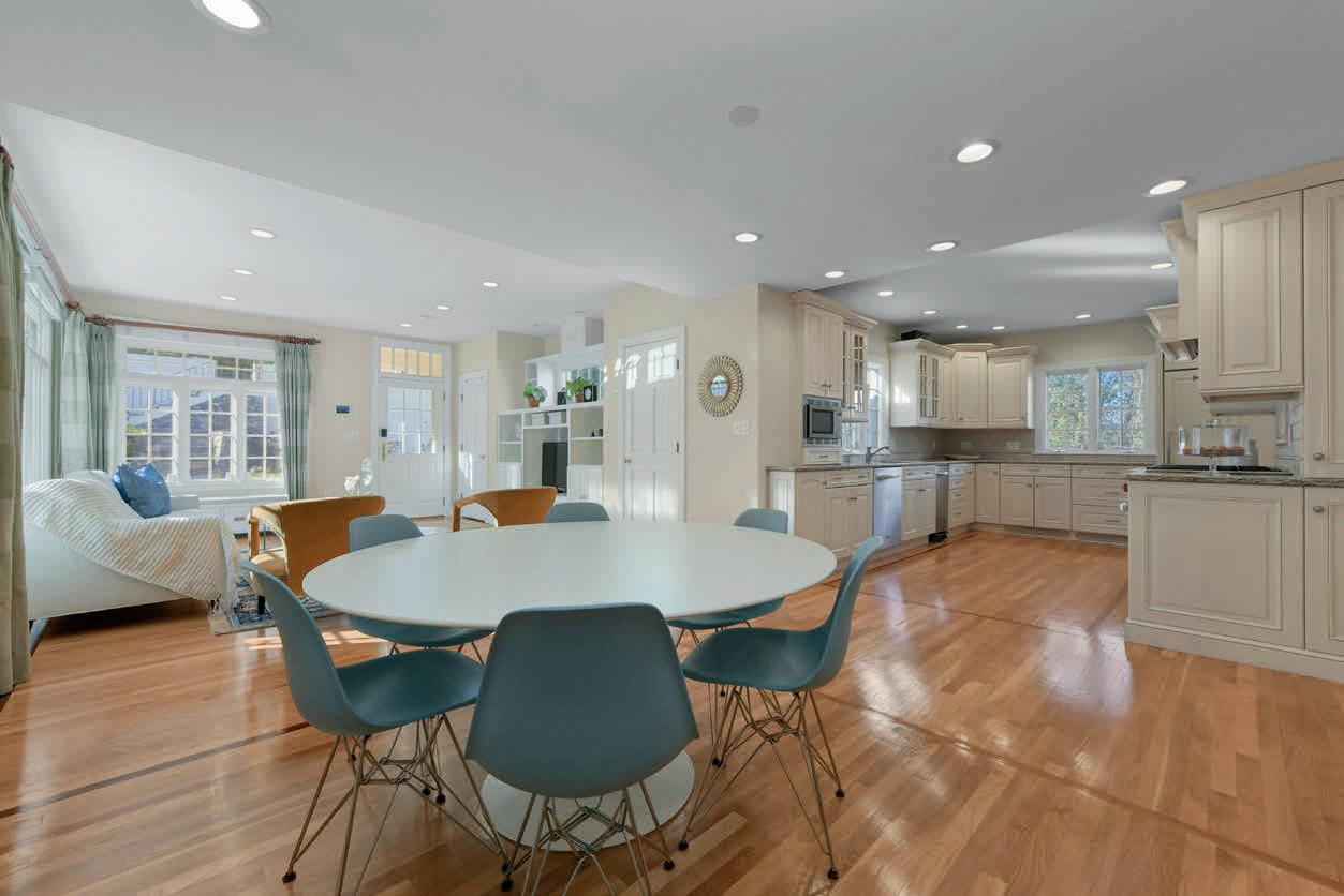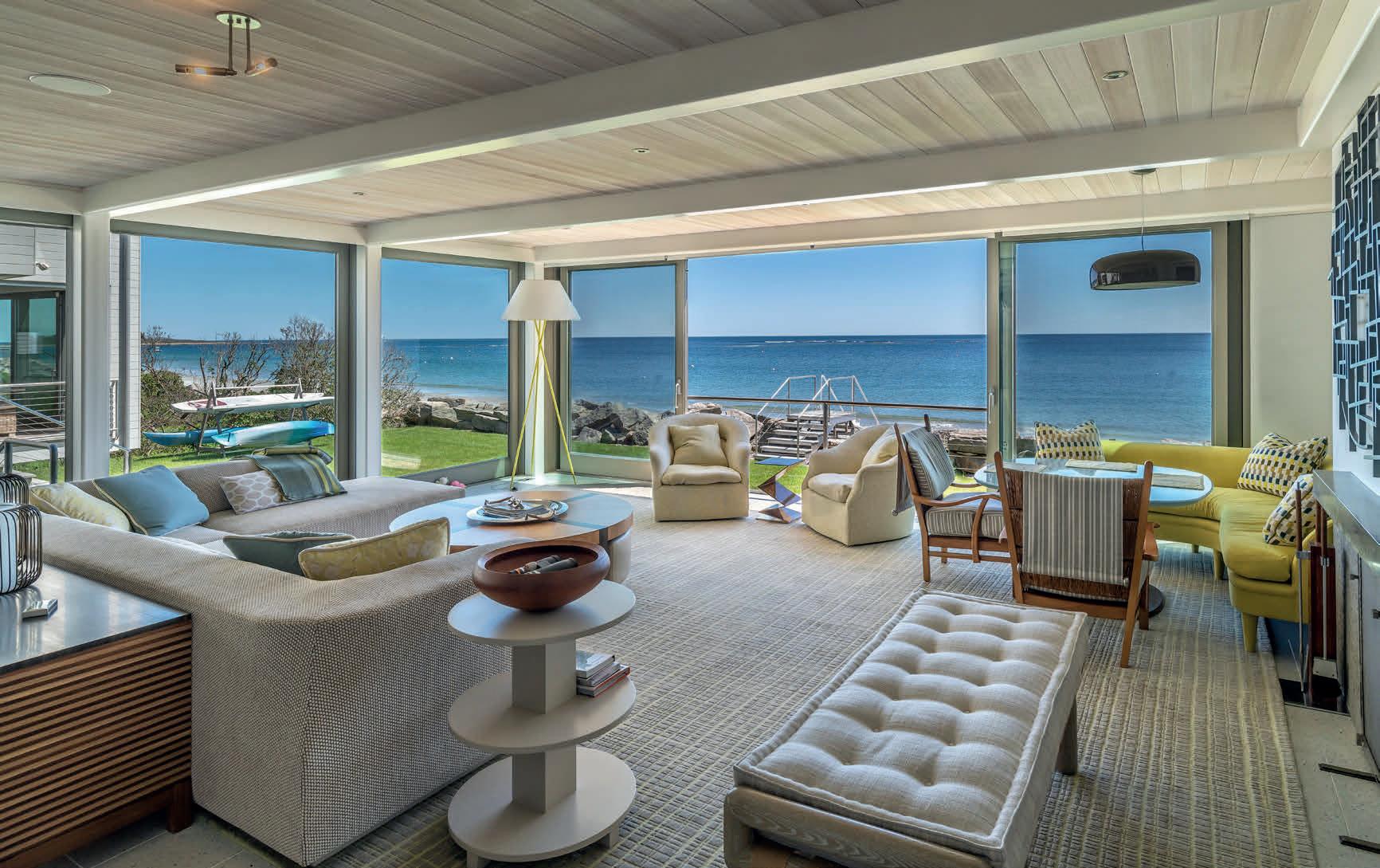 The residence features inspiring spaces with bespoke cherry oak panelled dining and living rooms, five spacious bedrooms, chef’s kitchen, 2.5 baths, sun room, 3 fireplaces, and a covered porch that frames the endless ocean vistas. Every detail was carefully selected to embrace the quality craftsmanship expected in a coastal home of this distinction.