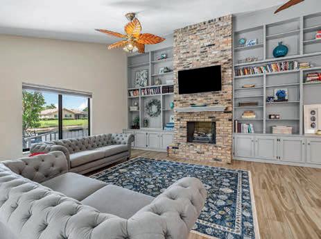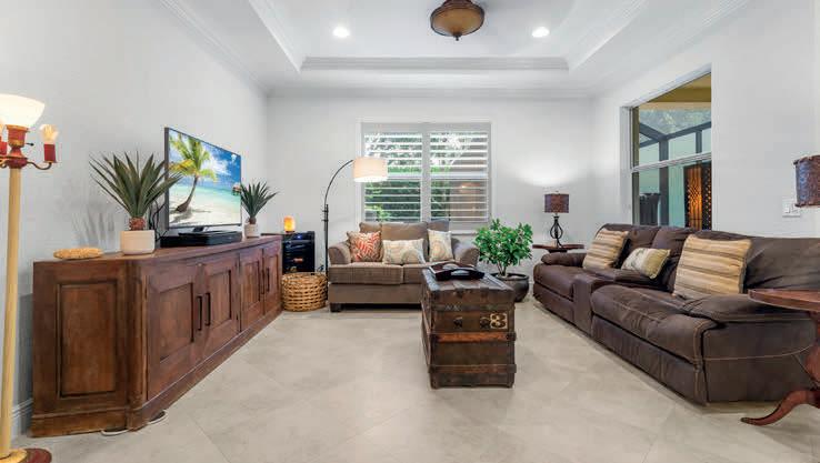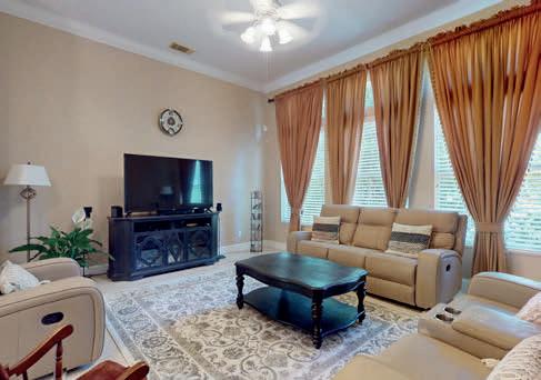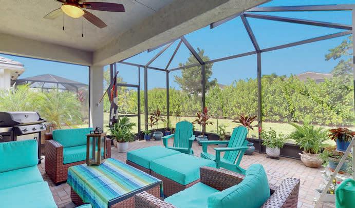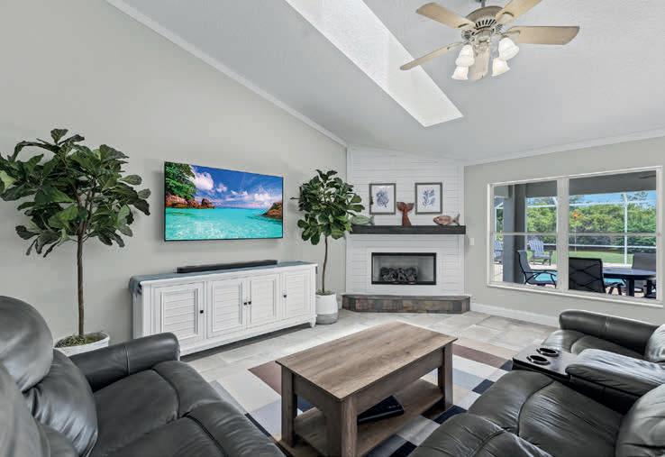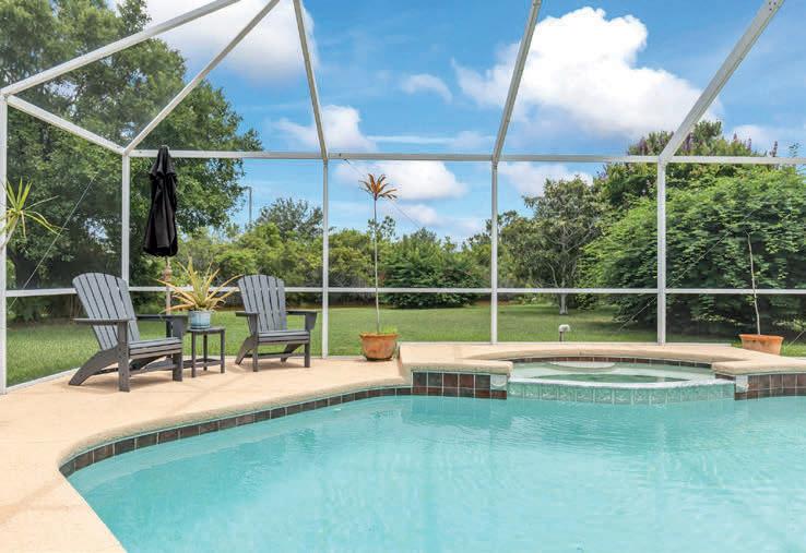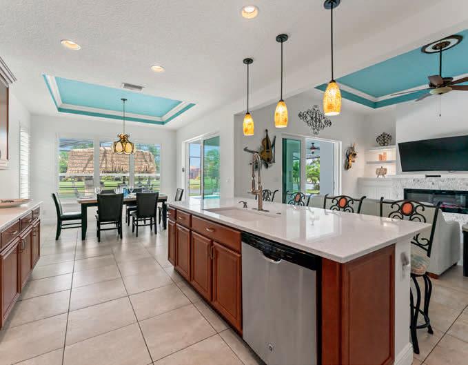 Welcome to this stunning Tuscan-inspired 3-bedroom 2 bath home, where style meets comfort in the vibrant 55+ active community of Vitalia. As you step into the foyer, you’re greeted by a sweeping view of the pool, setting the stage for the elegance that awaits. The foyer flows seamlessly into a wine cellarinspired atmosphere, leading to a great room featuring a built-in electric fireplace with a white stack stone facade and custom illuminated shelves. The landscape welcomes a Tiki outside grill Bar and the enclosed water fall pool area through the triple sliding doors onto the covered lanai. --perfect for entertaining and relaxing. The primary bedroom is spacious boasting an expansive bathroom. The house has 5 walk-in closets; lots of space for storage. The gourmet kitchen has a new white quartz counter land, 42” cabinets, customize expansive pantry with pull out shelves. The dining area has sliding doors leading to the pool side.