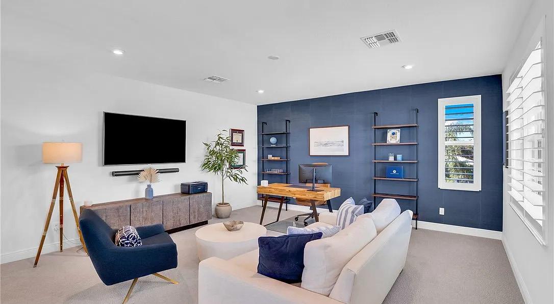 As you step into this remarkable home, you’ll be greeted by an elegant living room designed for entertaining with large open windows and the backyard as your conversation piece. The well-appointed gourmet kitchen is perfectly complemented by a sunlit breakfast area and an expansive family room. The owner’s suite has a sitting room with coffered ceilings and a bay window overlooking the glistening pool. There are three guest bedrooms and a private study offering a quiet space for work or reflection.